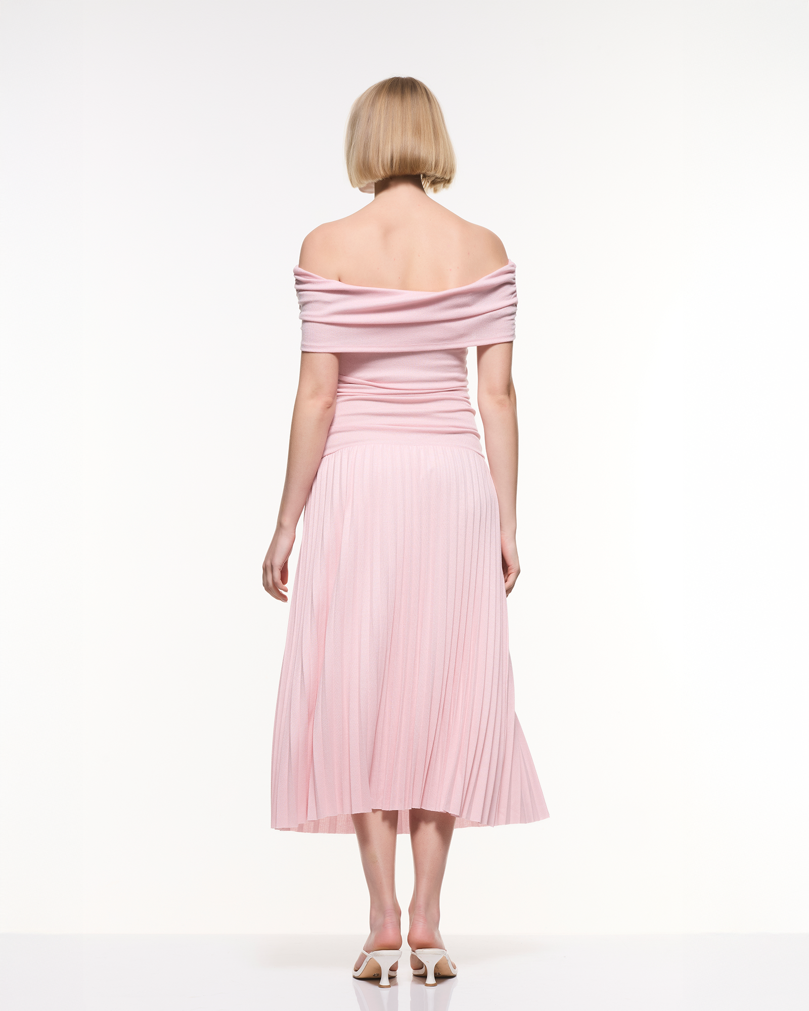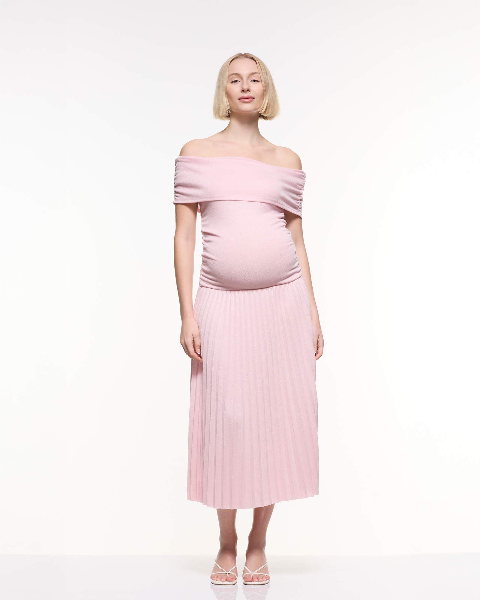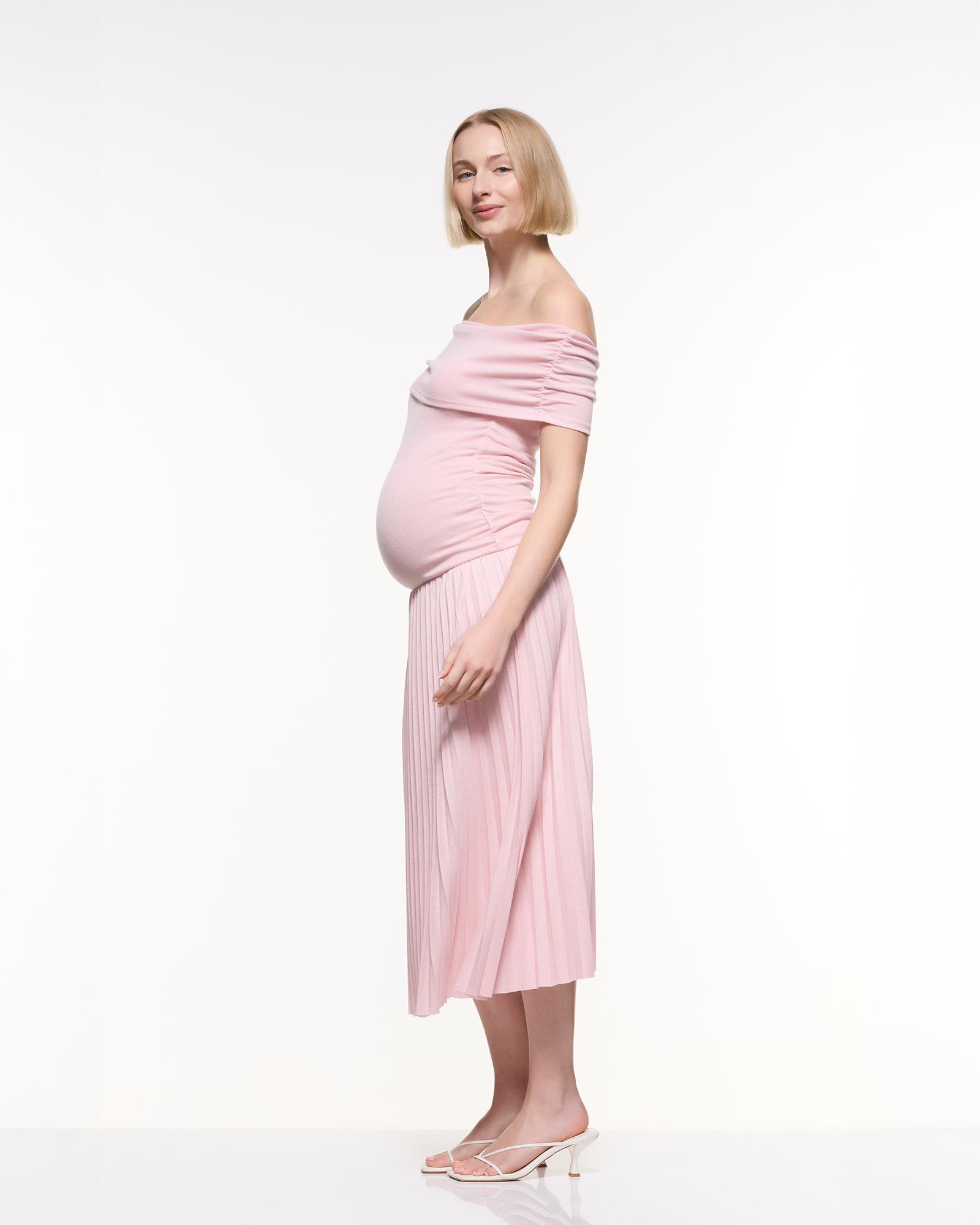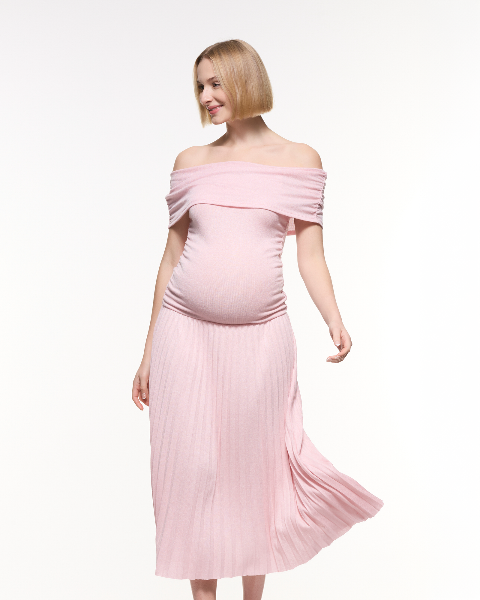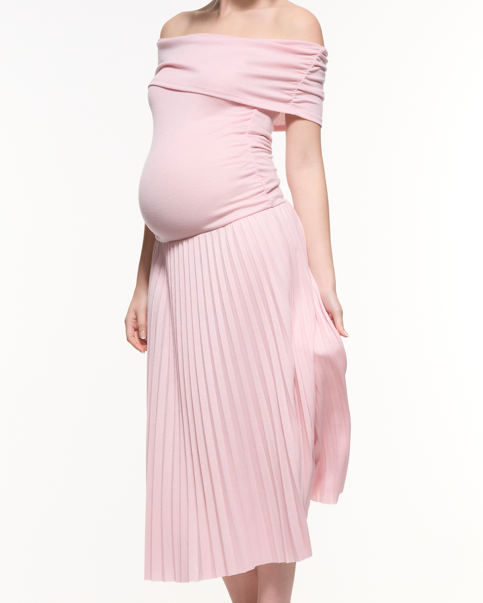 A feminine off-shoulder maternity midi dress featuring a soft, stretchy bodice and a beautifully pleated skirt. Designed to flatter your bump with effortless elegance, making it perfect for baby showers, photoshoots, and special occasions.