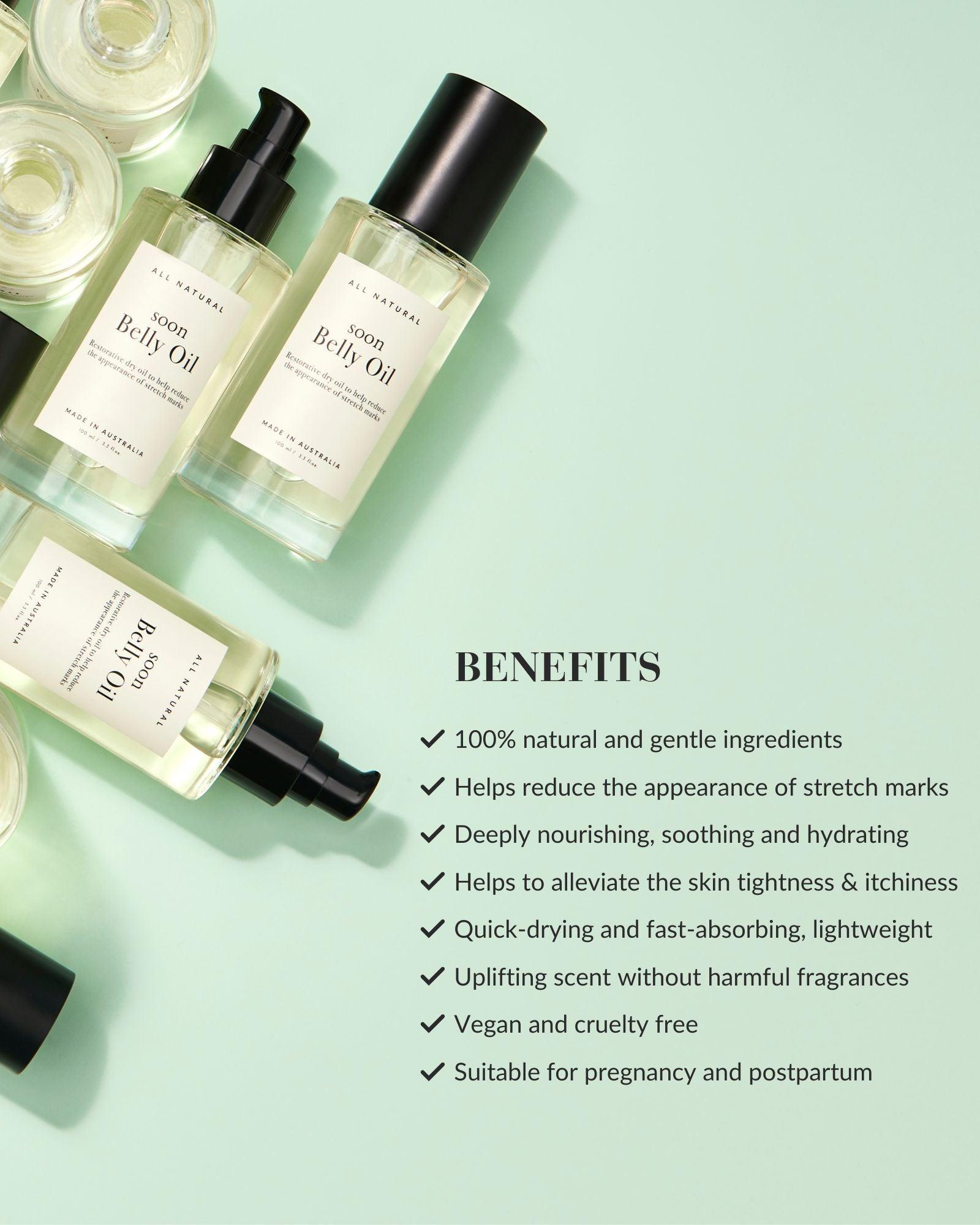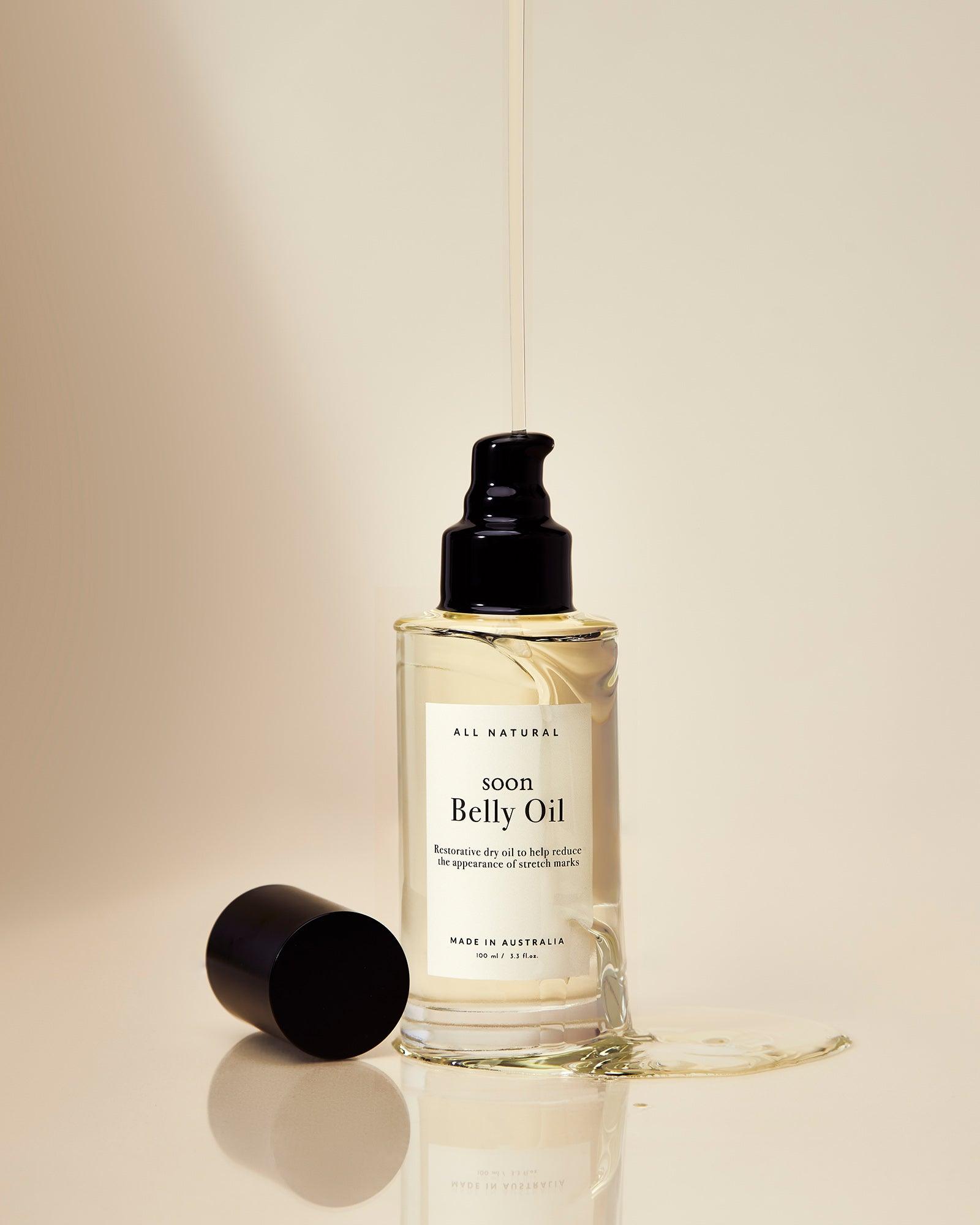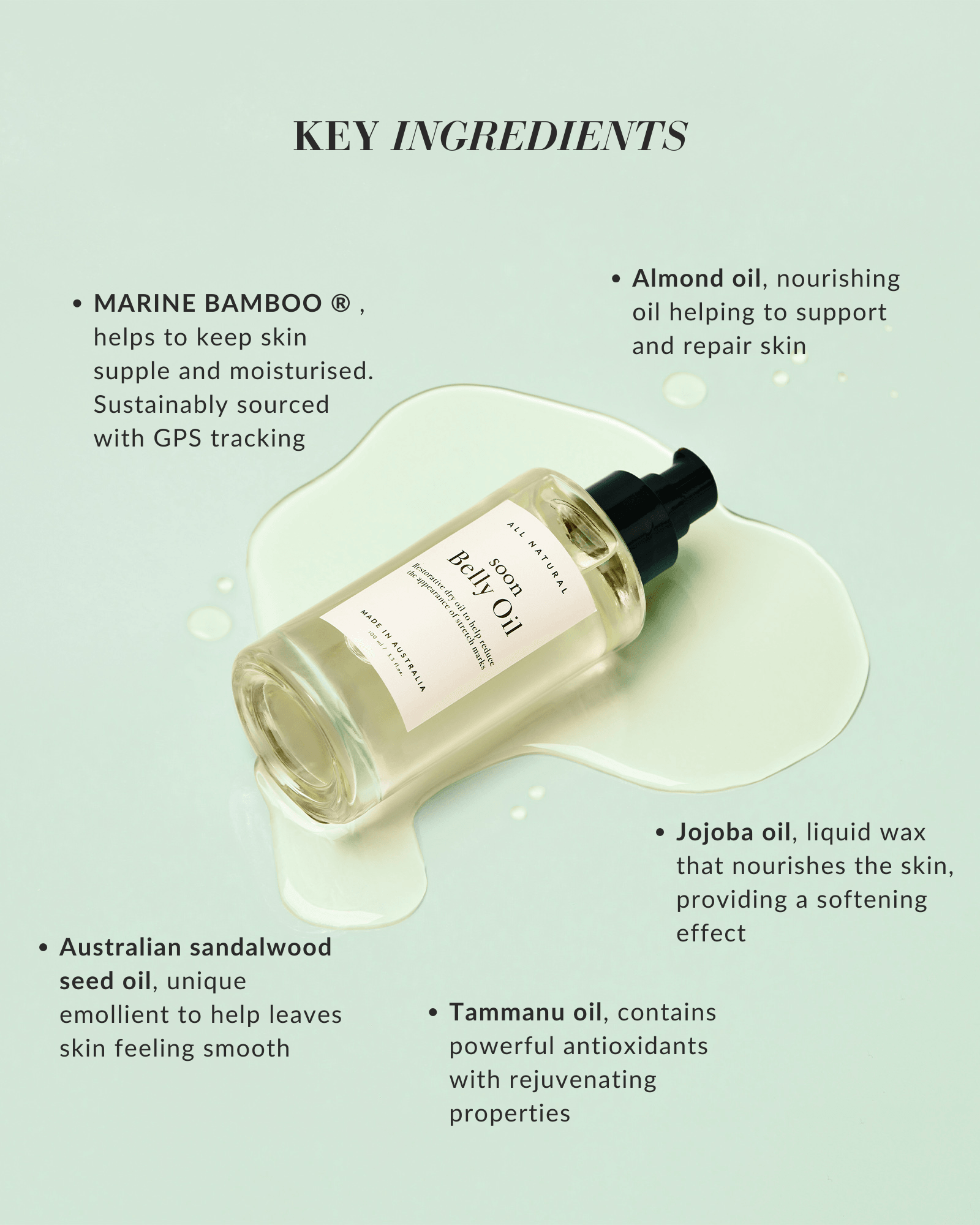 Our powerful all-natural belly oil contains MARINE BAMBOO™️ an algae sustainably sourced from the ocean. Rich in firming and protective properties that deeply hydrate and nourish the skin while boosting elasticity. Formulated in collaboration with an industry expert our belly oil is designed to support your growing belly throughout pregnancy and beyond.