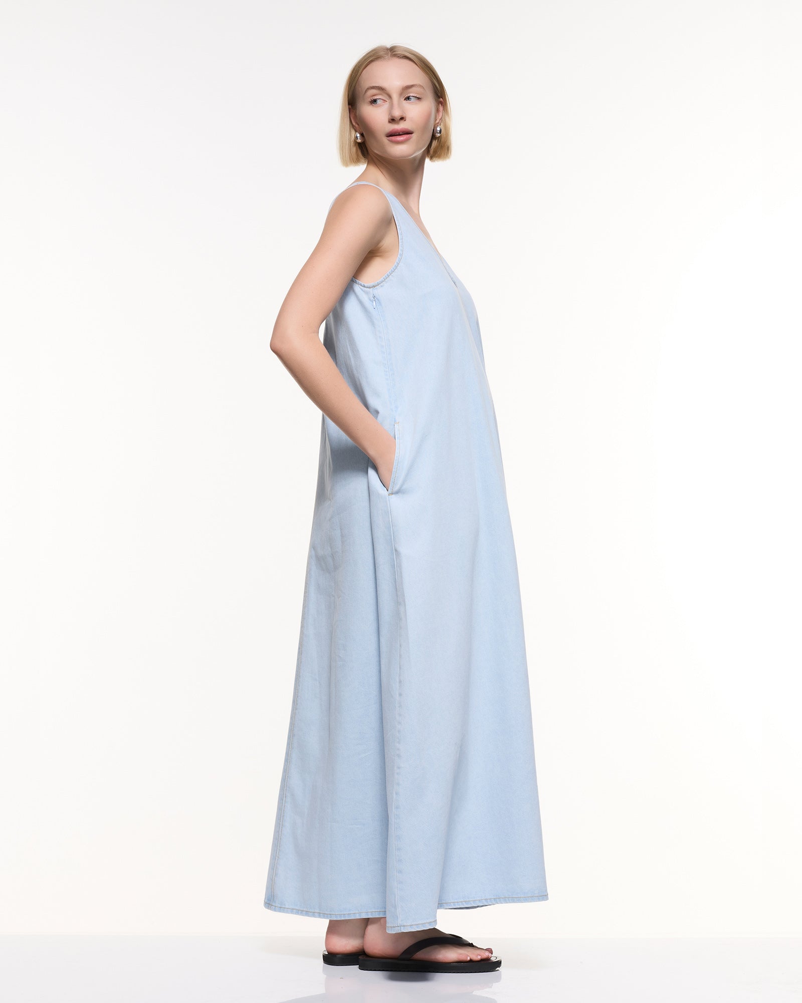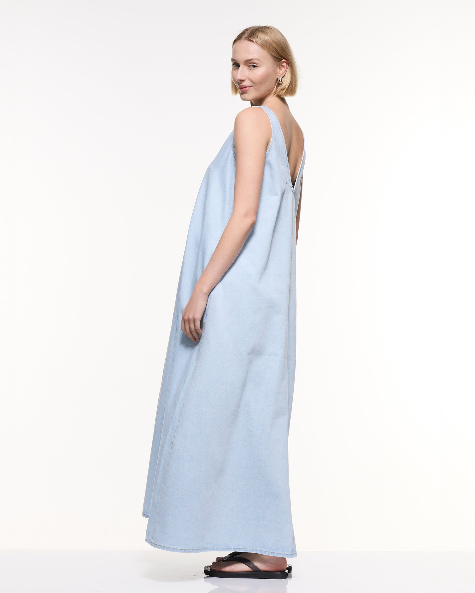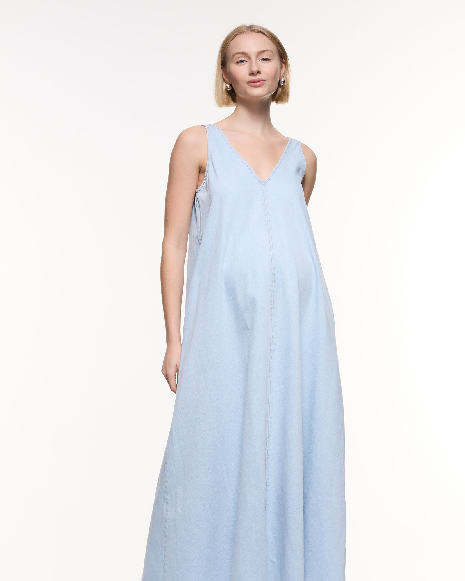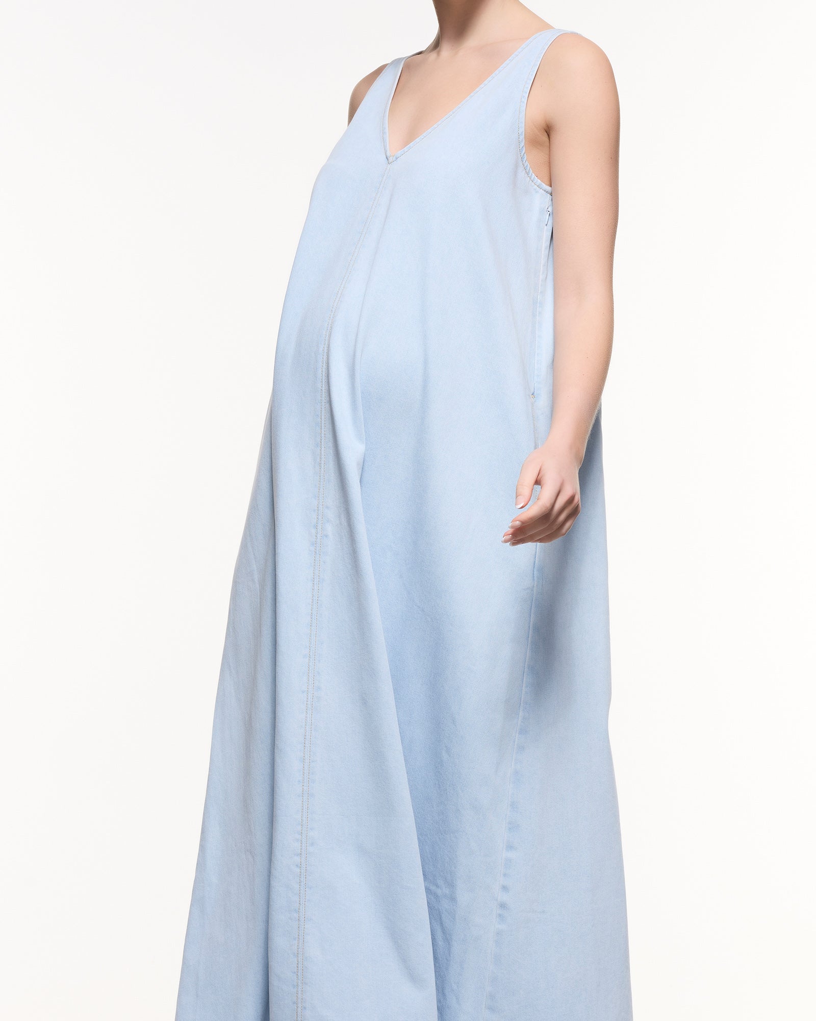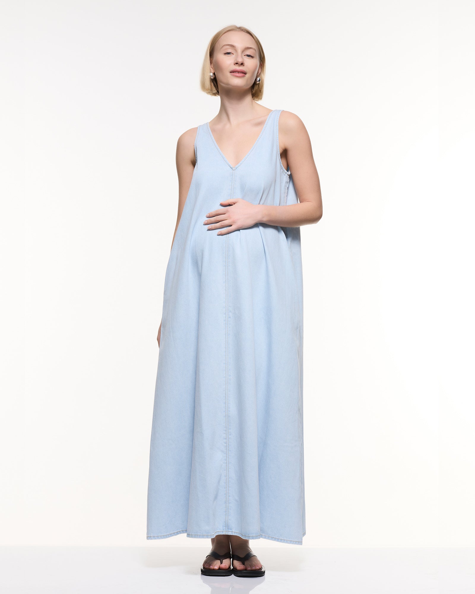 A modern maternity staple designed to grow with you and beyond. Crafted in soft light-wash denim with a relaxed maxi silhouette, this dress features a flattering V-neckline, side zips for easy nursing access, and a breezy sleeveless cut — perfect for pregnancy, postpartum, and summer styling.