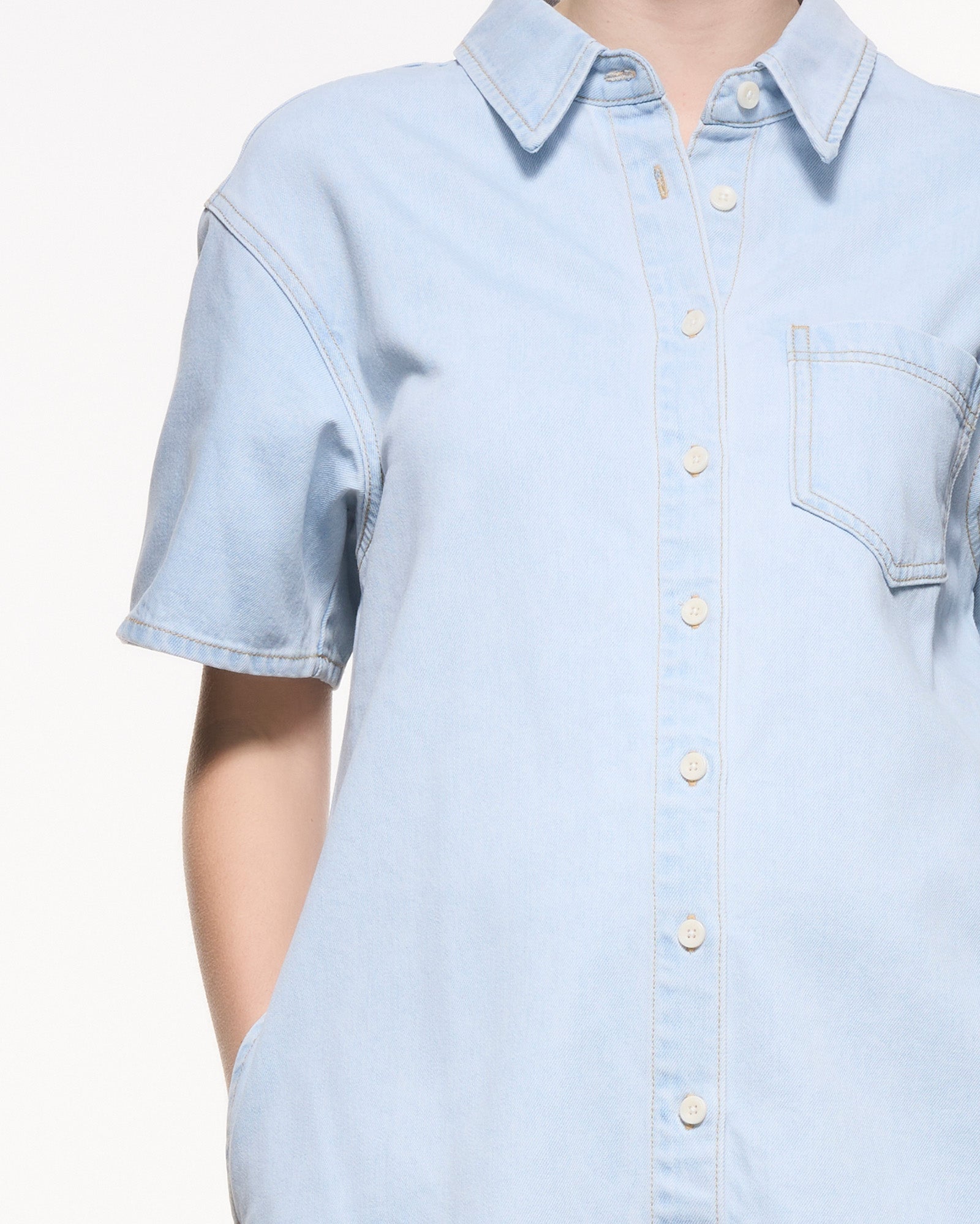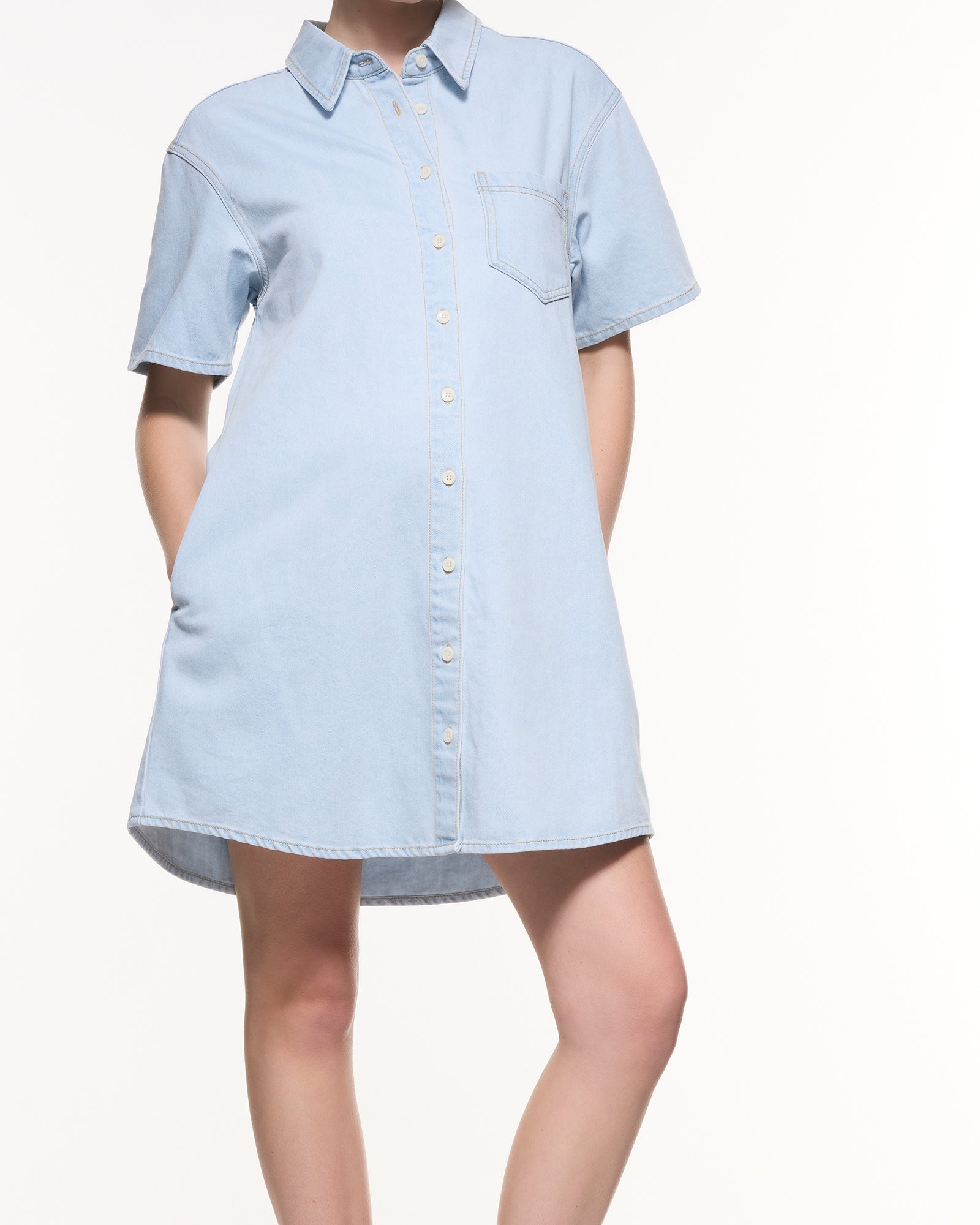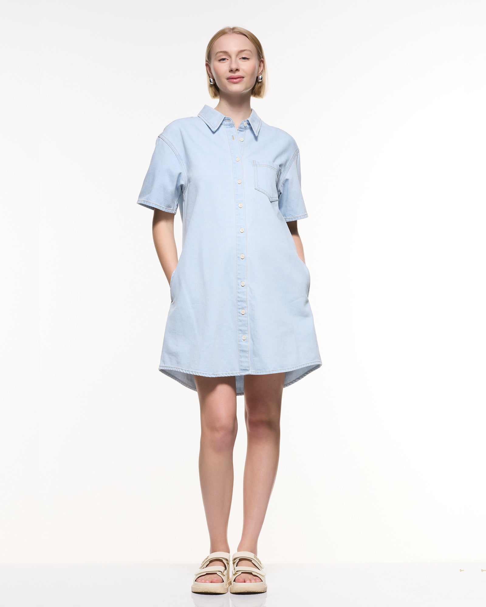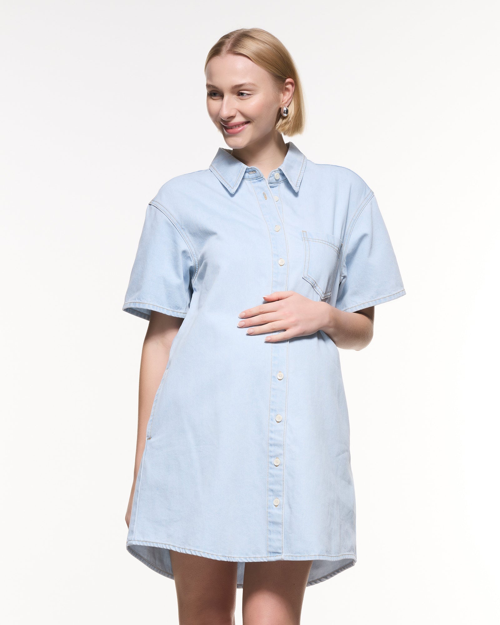 The Luna Denim Shirt Dress is a modern maternity essential designed for comfort and style from pregnancy to postpartum. Crafted in soft, lightweight denim, it features a relaxed silhouette, curved hemline, and a full button-down front for easy nursing access. Perfect for everyday wear, it can be styled effortlessly with sneakers or boots for a polished yet relaxed look.