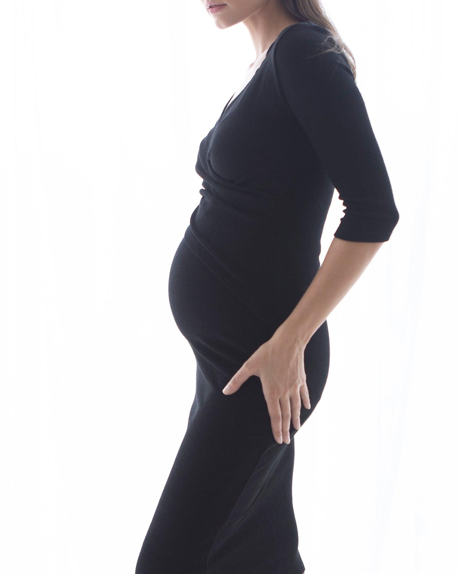 A must have addition to your maternity and nursing wardrobe is our Cross Wrap Feeding Dress. Designed in an ultra-soft rib knit fabric that has the perfect amount of stretch, this dress has a bump hugging silhouette. The clever cross wrap design has a double layer at the bust making it easy to nurse discreetly while also offering support. Designed to sit at a flattering midi length and with a 3/4 sleeve, this dress can be worn to the office, dinner or even casually with a pair of sneakers.