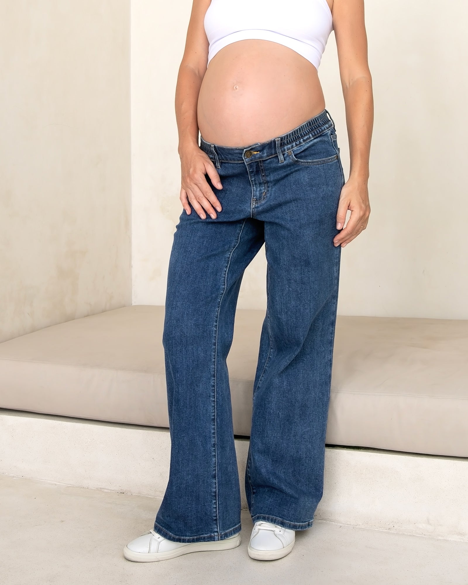 Designed for longevity, the Heaven Straight Jeans are a must in your motherhood wardrobe. With our signature elastic waistband that sits at a comfortable low to mid rise on the belly through all trimesters and well after pregnancy, these jeans have a traditional button and fly and four pocket design and a super flattering wide leg silhouette. The classic blue wash pairs back well with any top and they have just the right amount of stretch.