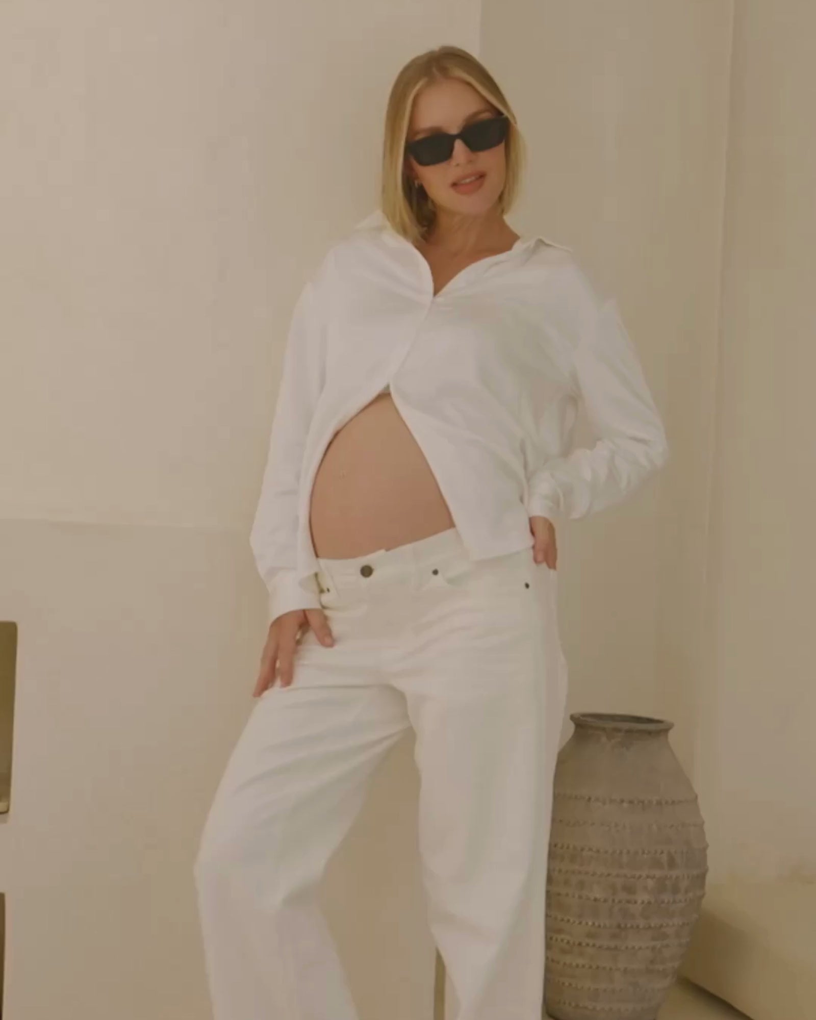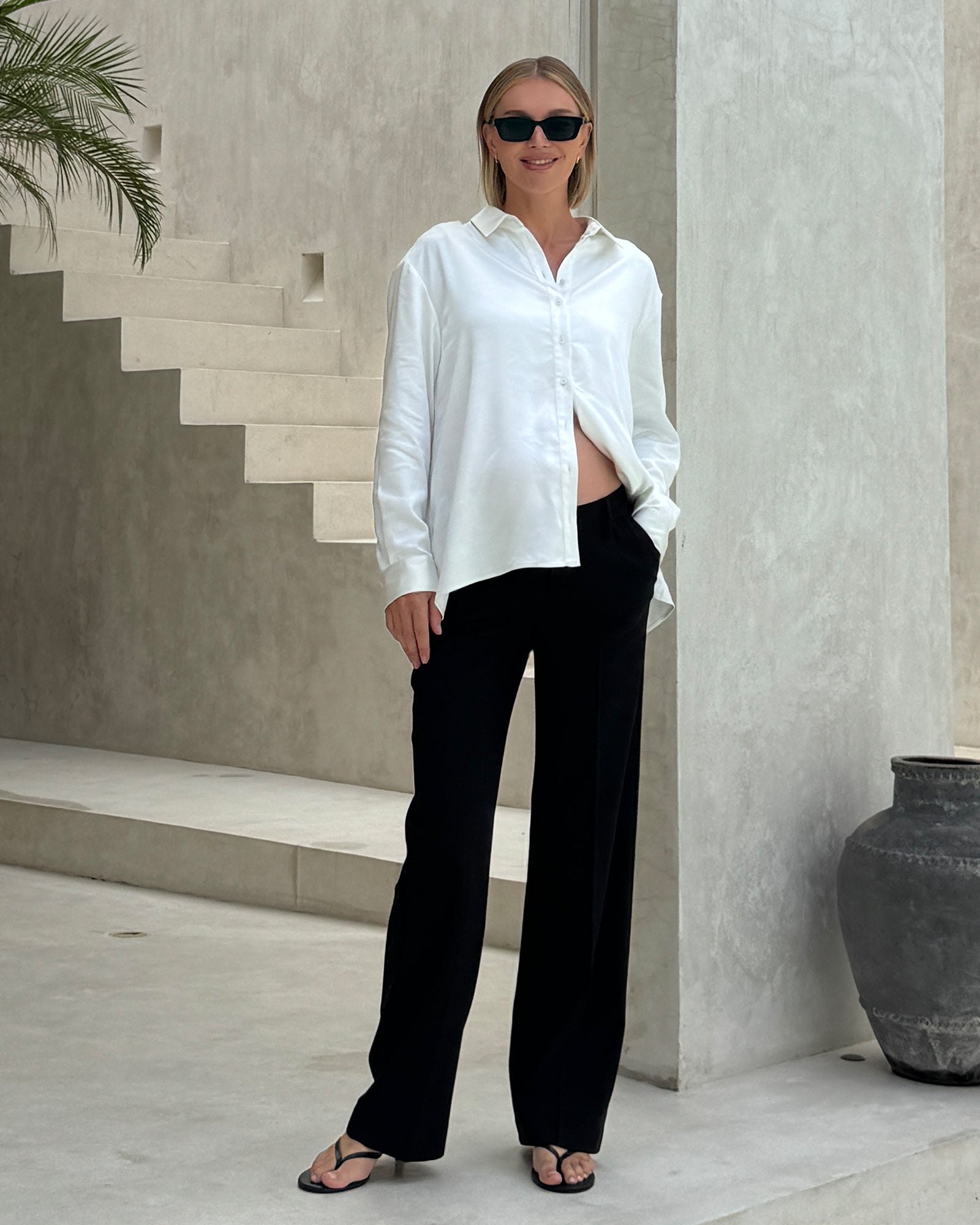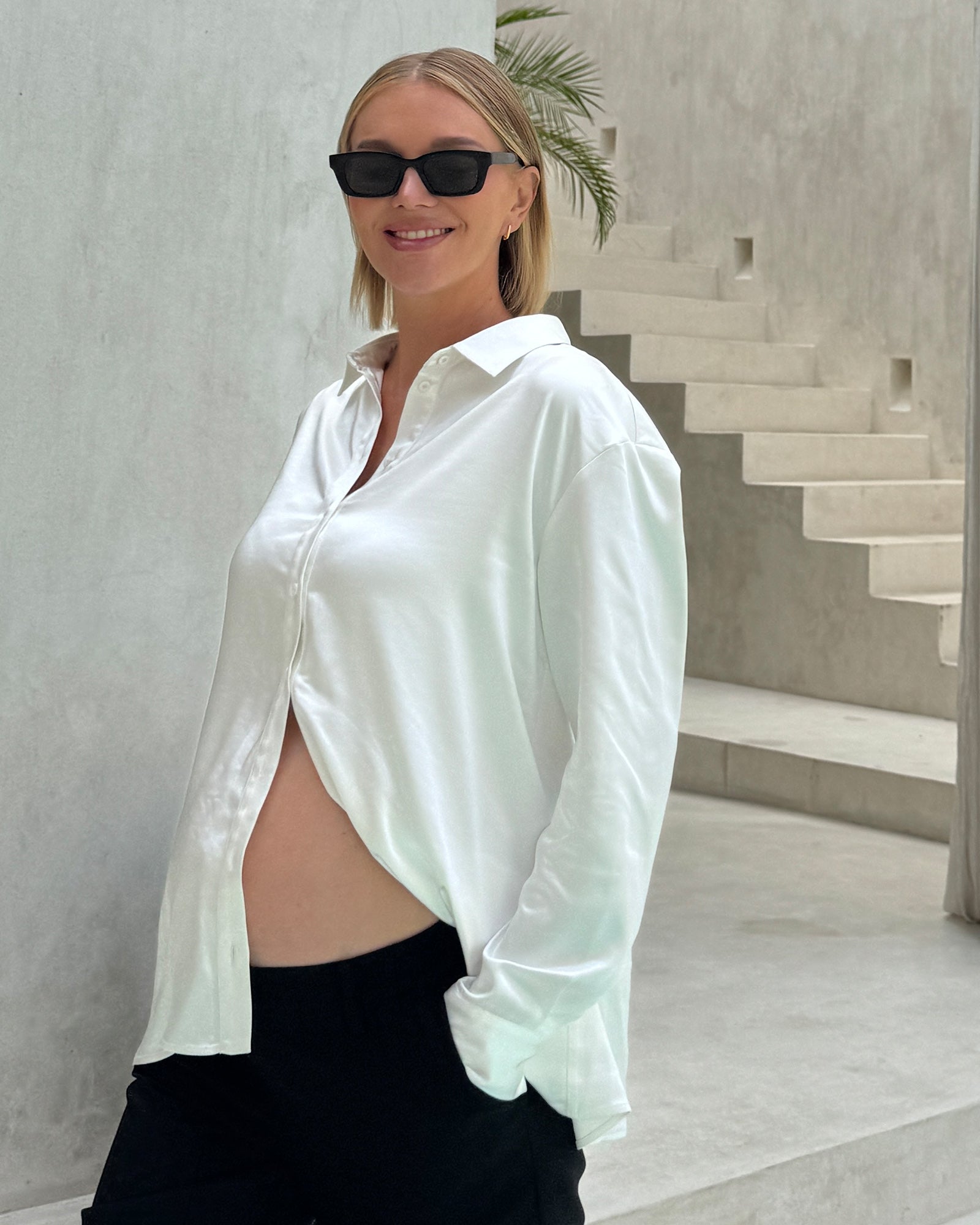 Crisp, clean, and effortlessly versatile — the Classic Cotton Shirt in white is a wardrobe essential for pregnancy and beyond. Made from a breathable cotton blend, it features a flattering slightly A-line shape that accommodates your growing bump without compromising on style. Perfect for the office, brunch, or layered over a tank and leggings for an elevated casual look.