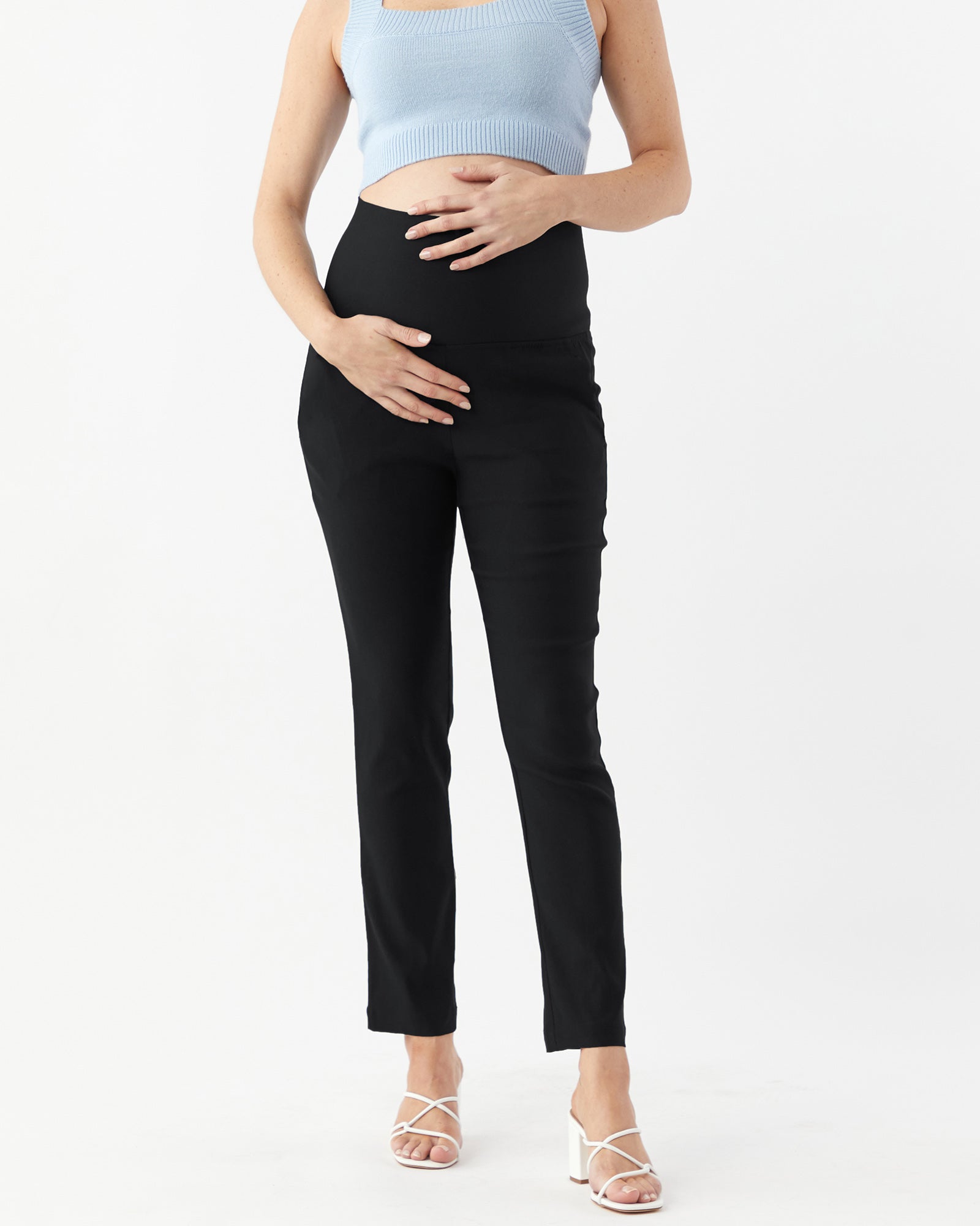 The newest edition to our flora workwear family is the Flora Skinny Capri. Featuring a wide stretch waistband which can be worn over your belly or folded down and a skinny leg that is cropped to sit just above the ankle. This work pant is flattering throughout all stages of pregnancy and into your postpartum days.