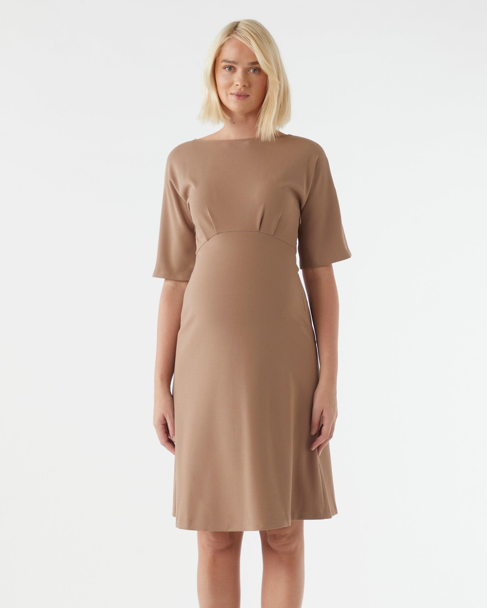 Crafted in a beautiful stretch crepe fabric and designed for maternity and nursing, the Love Flare Midi Dress will take you seamlessly from the office to dinner. With a fitted waist and flattering flared skirt that sits just below the knee, the dress features a classic boat neckline, side zips for discreet nursing, and a flared sleeve which is finished with a deluxe woven tape to hide the seams.