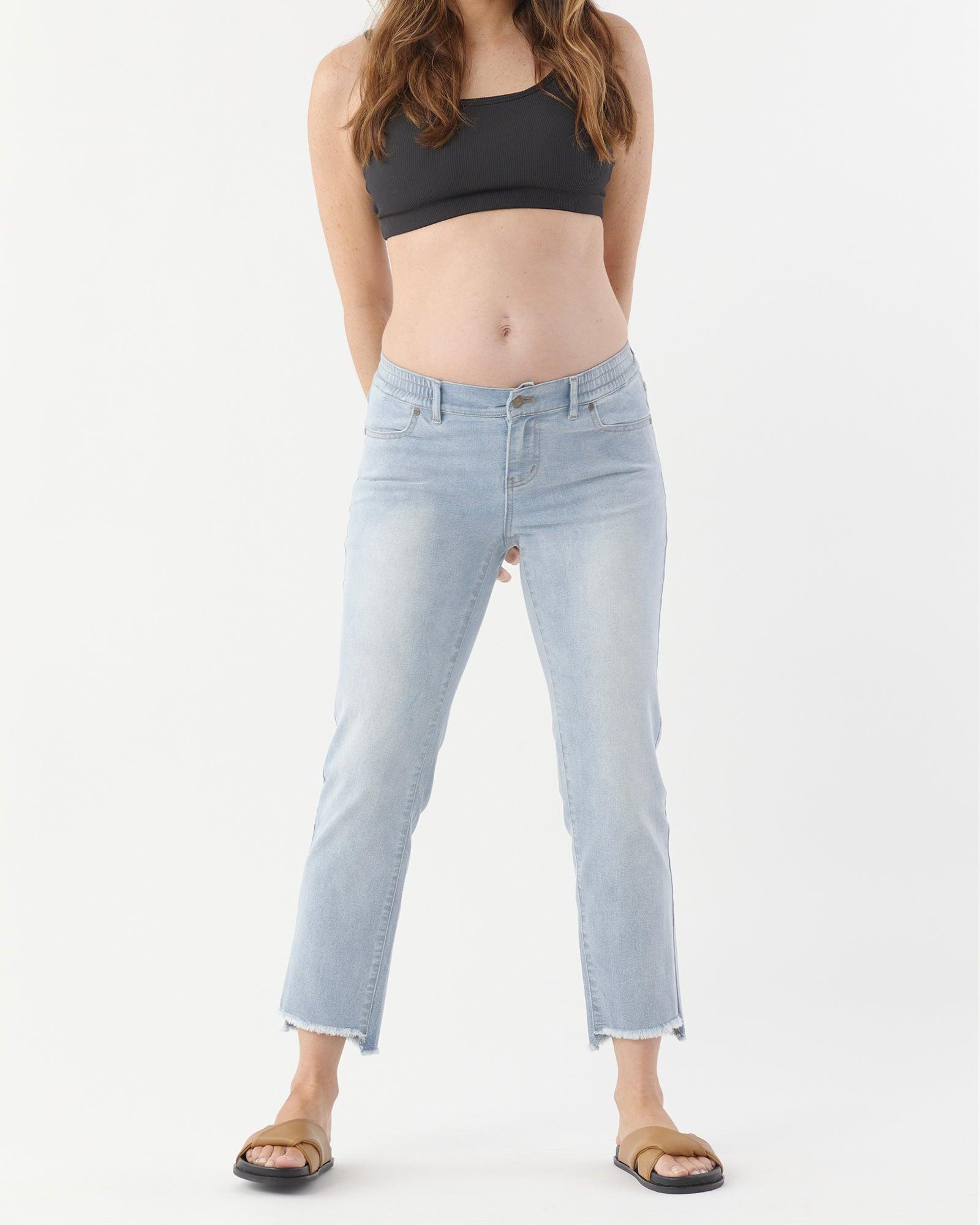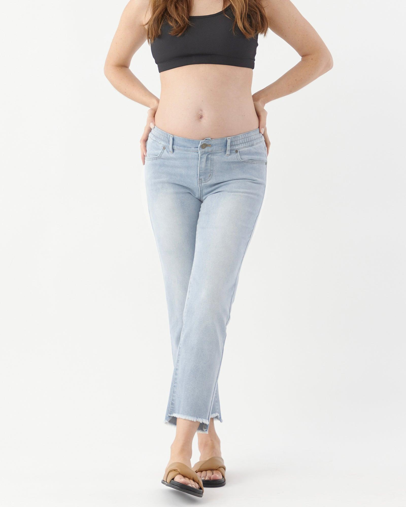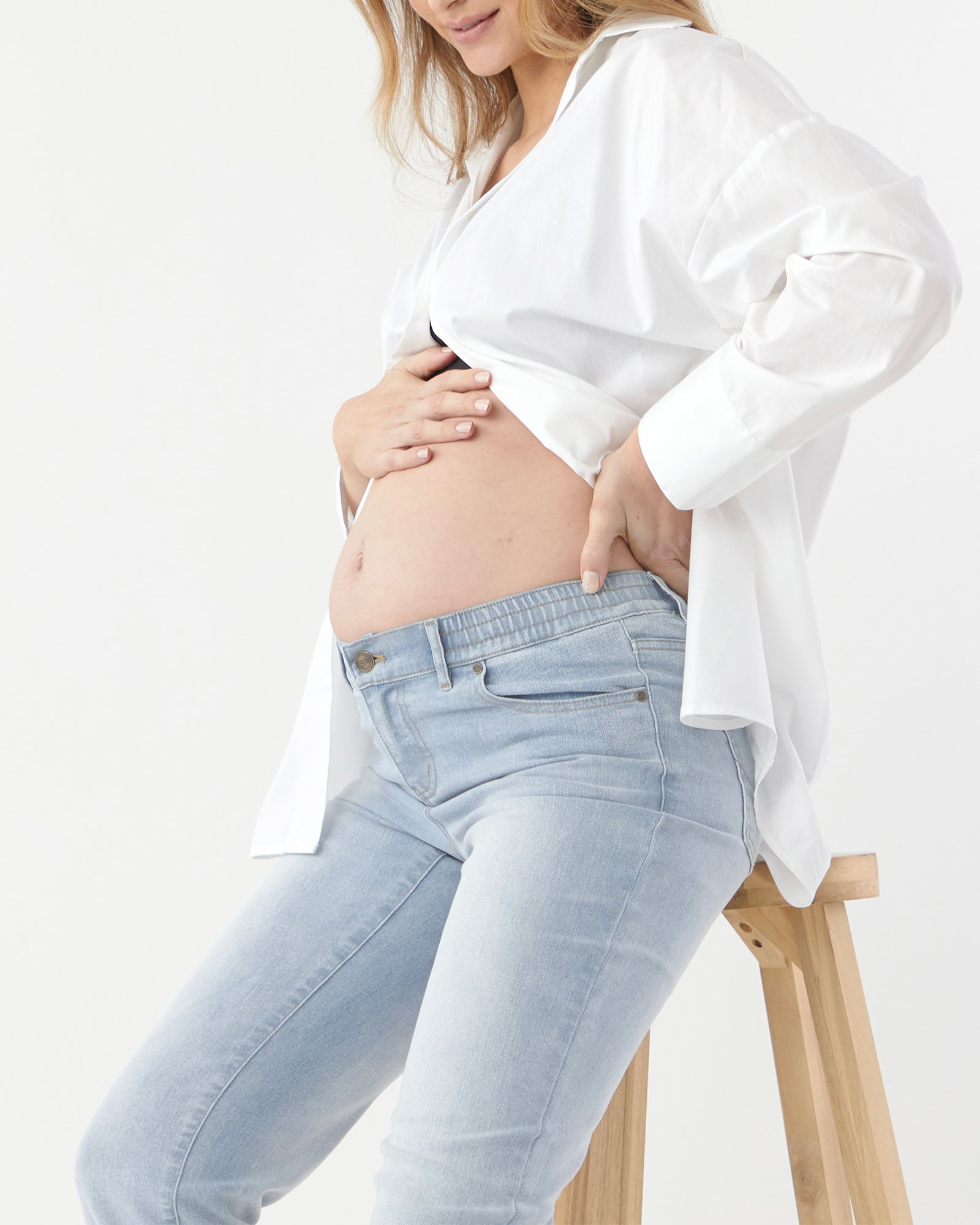 If you’re after a cool and stylish maternity denim look, our Mid Rise Slim Straight Jean will be a staple piece in your wardrobe. Cut to sit just above the ankle and with a frayed hem, these jeans have a classic button and fly and elastic waistband for extra comfort through all trimesters and well after your pregnancy. The leg has a flattering straight but also slim silhouette.