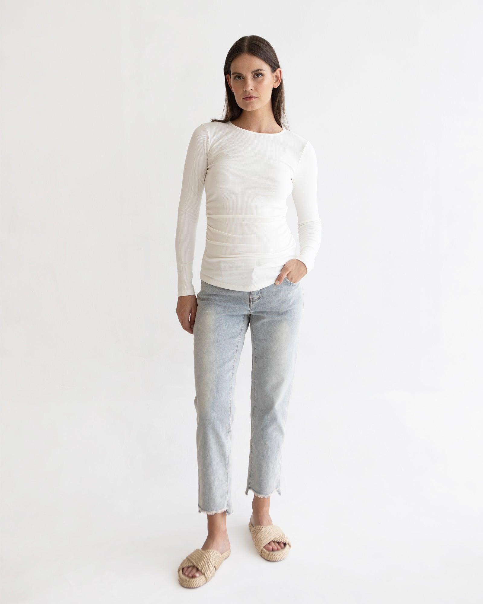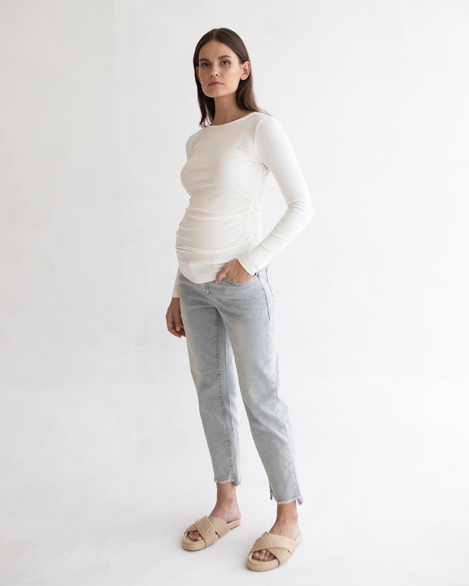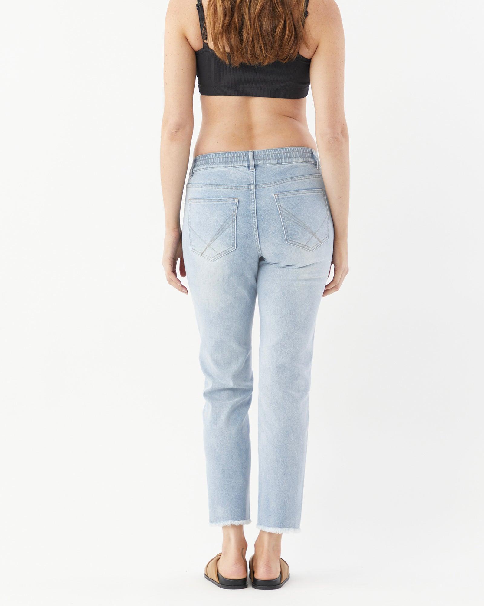 If you’re after a cool and stylish maternity denim look, our Mid Rise Slim Straight Jean will be a staple piece in your wardrobe. Cut to sit just above the ankle and with a frayed hem, these jeans have a classic button and fly and elastic waistband for extra comfort through all trimesters and well after your pregnancy. The leg has a flattering straight but also slim silhouette.