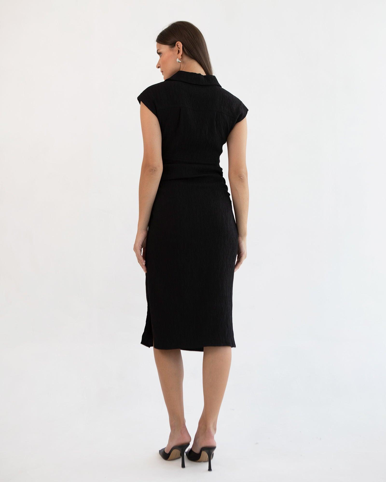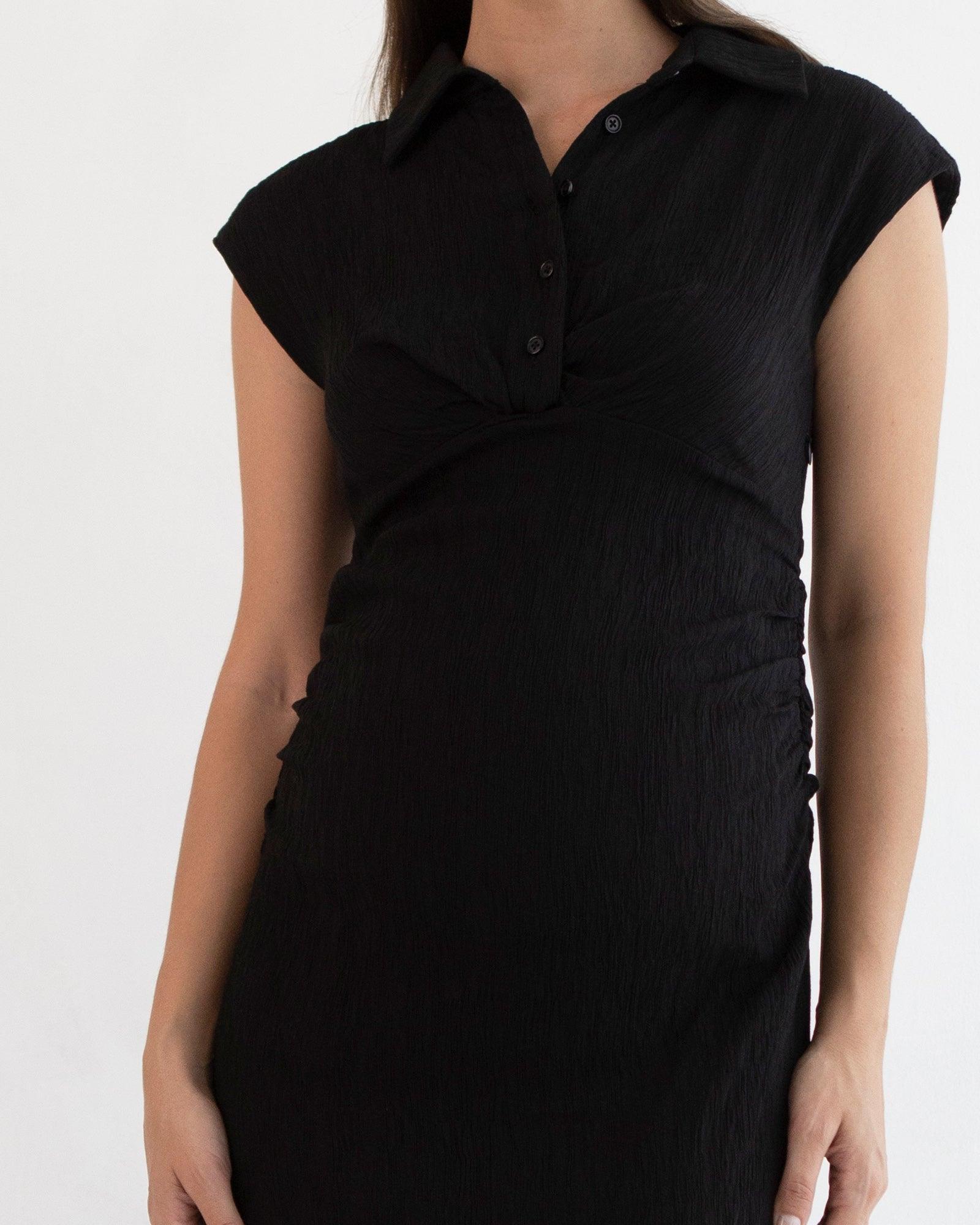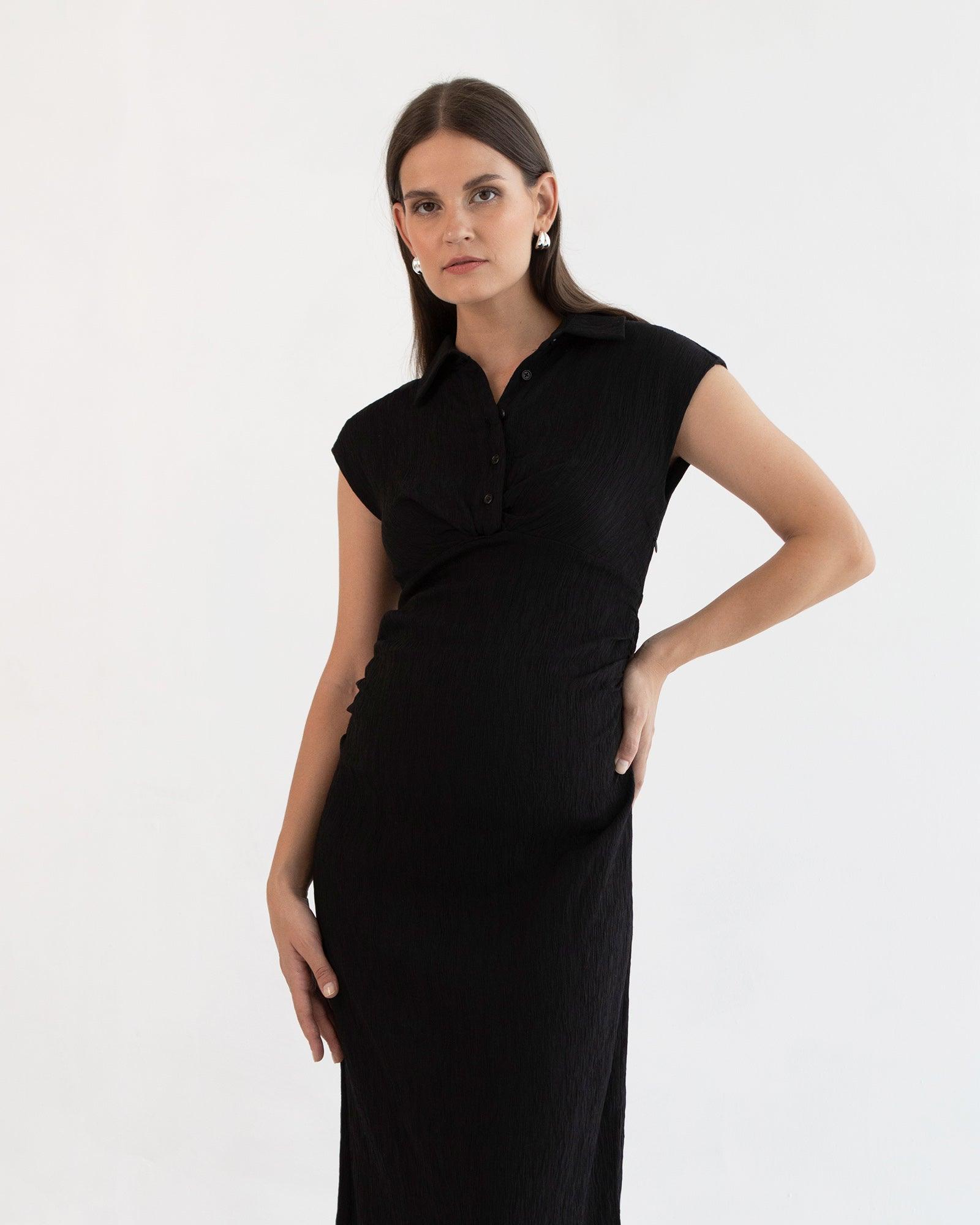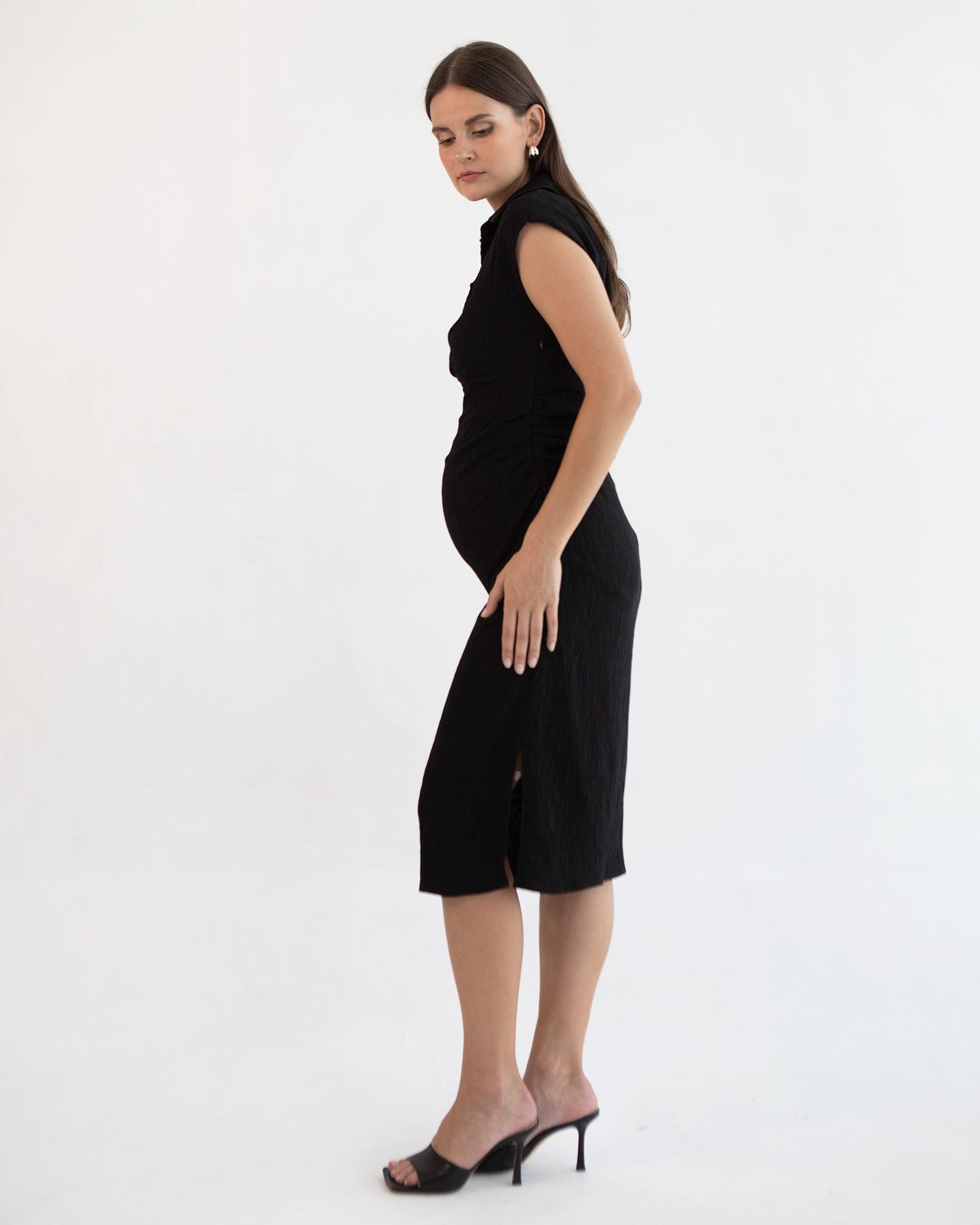 A beautiful dress to add to your wardrobe for your pregnancy and well after is our Noah Knot Front Dress. Designed in a lightweight cotton blend fabric with a soft crinkle texture, the dress sits at a flattering midi length and has a button down front to the waist also making it ideal for nursing. The twist front adds shape and there is a split on one side of the skirt. It features a classic collar, capped shoulders, a zip opening on one side and is lined.