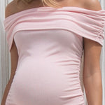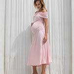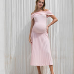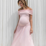 A feminine off-shoulder maternity midi dress featuring a soft, stretchy bodice and a beautifully pleated skirt. Designed to flatter your bump with effortless elegance, making it perfect for baby showers, photoshoots, and special occasions.