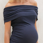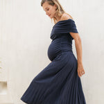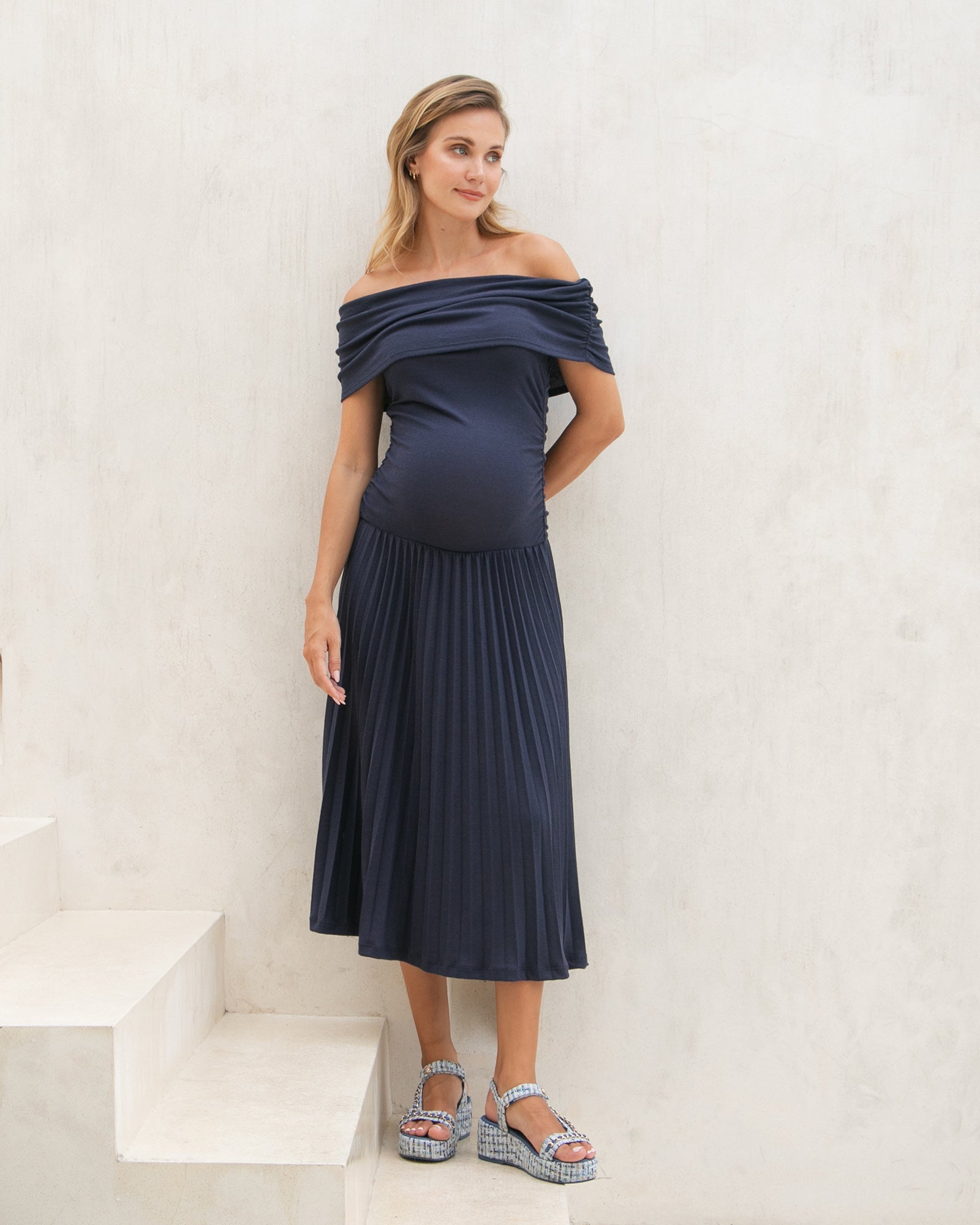 A feminine off-shoulder maternity midi dress featuring a soft, stretchy bodice and a beautifully pleated skirt. Designed to flatter your bump with effortless elegance, making it perfect for baby showers, photoshoots, and special occasions.