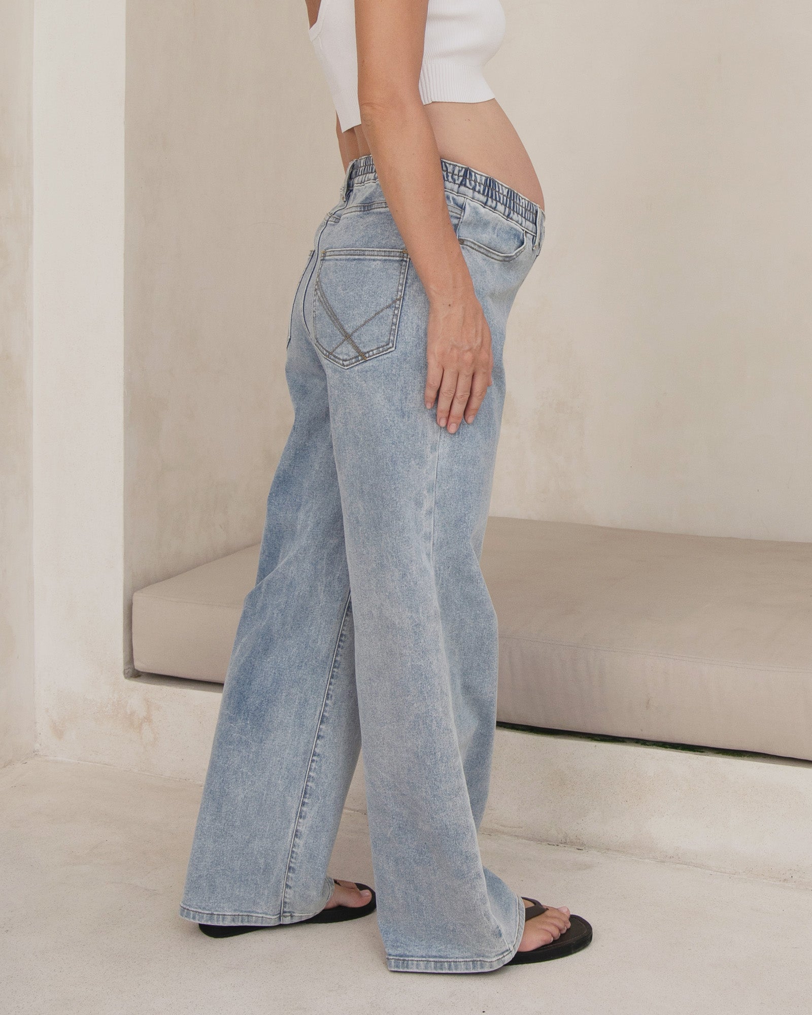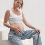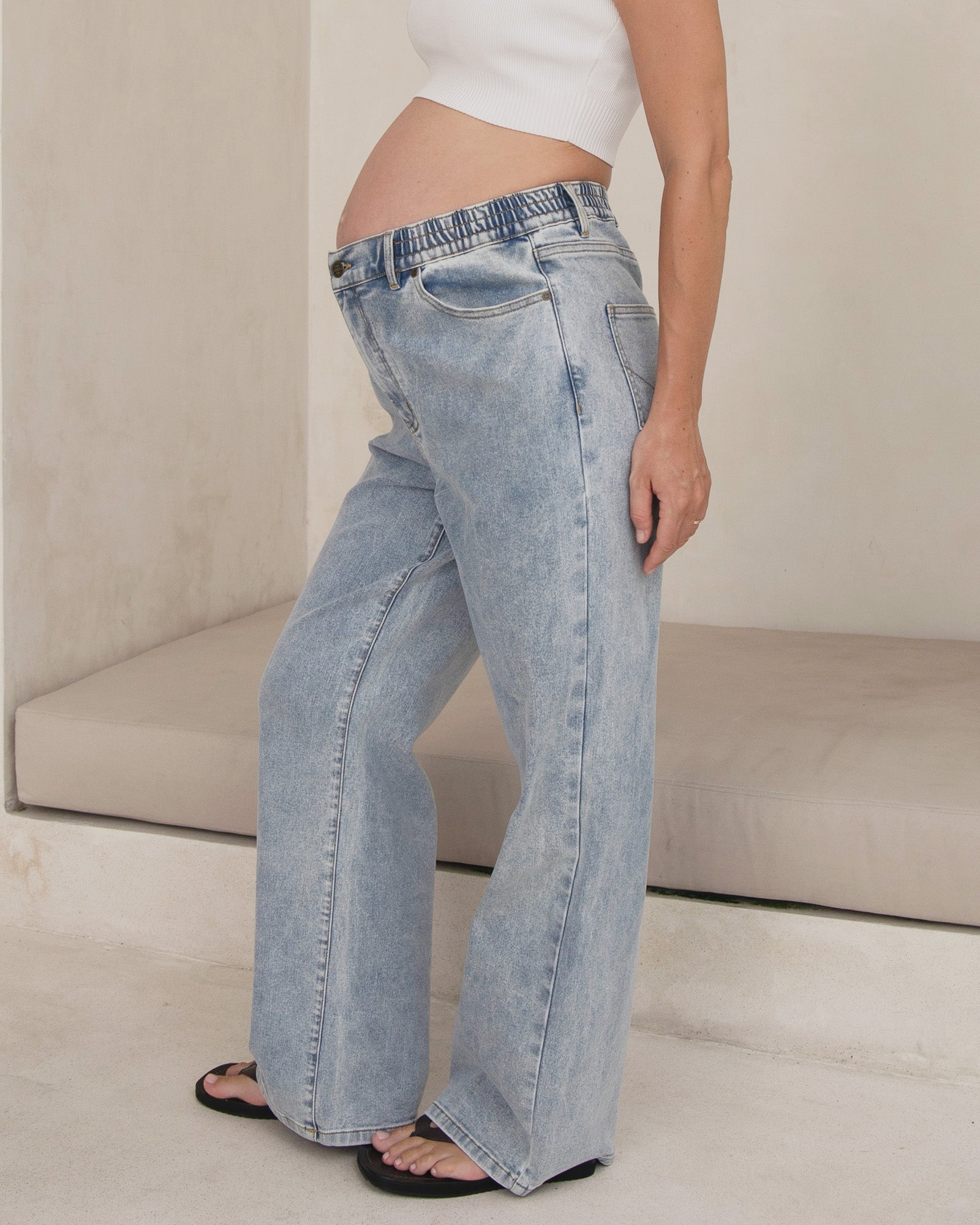 The ultimate mum jeans! Our Relaxed Wide Leg Jeans are the perfect blend of style and comfort. Designed with our signature full elastic waistband that sits over your belly, they feature classic denim details including pockets, metal rivets and a button & fly closure. The wide and relaxed leg is flattering and on-trend. These jeans will be on repeat throughout your pregnancy and loved well after.