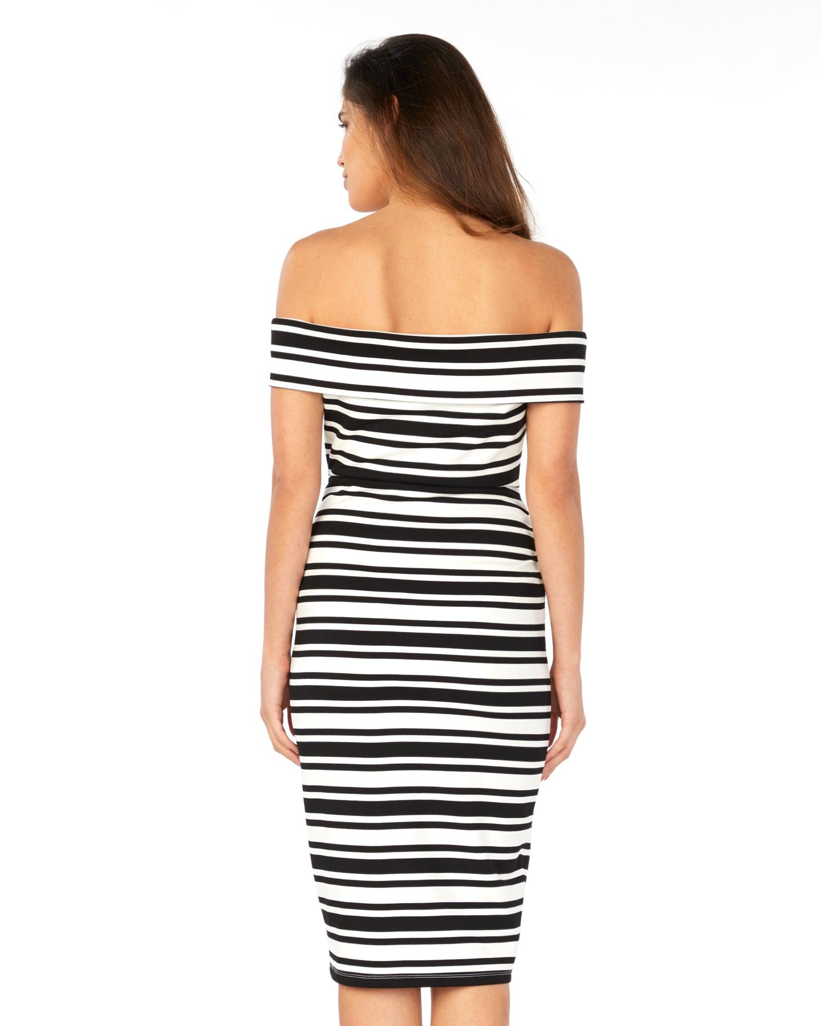 Made with a classic bump hugging silhouette and off-shoulder neckline, this dress is a show-stopper! The crepe knit fabrication looks beautifully dressy but has enough stretch to grow with you during pregnancy. Featuring side-seam ruching to show off your bump in all the right places and also give it plenty of room to grow. The neckline is a fold down panel that covers your upper arms while showing off your collar bone in a feminine and flattering way.