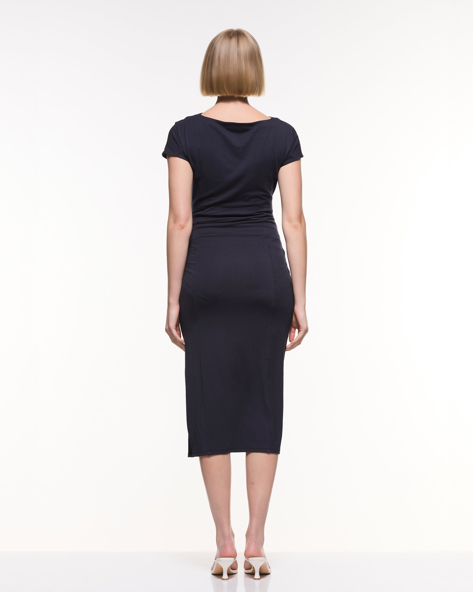 The Victoria Gathered Dress is an elegant maternity midi designed to flatter through every stage.