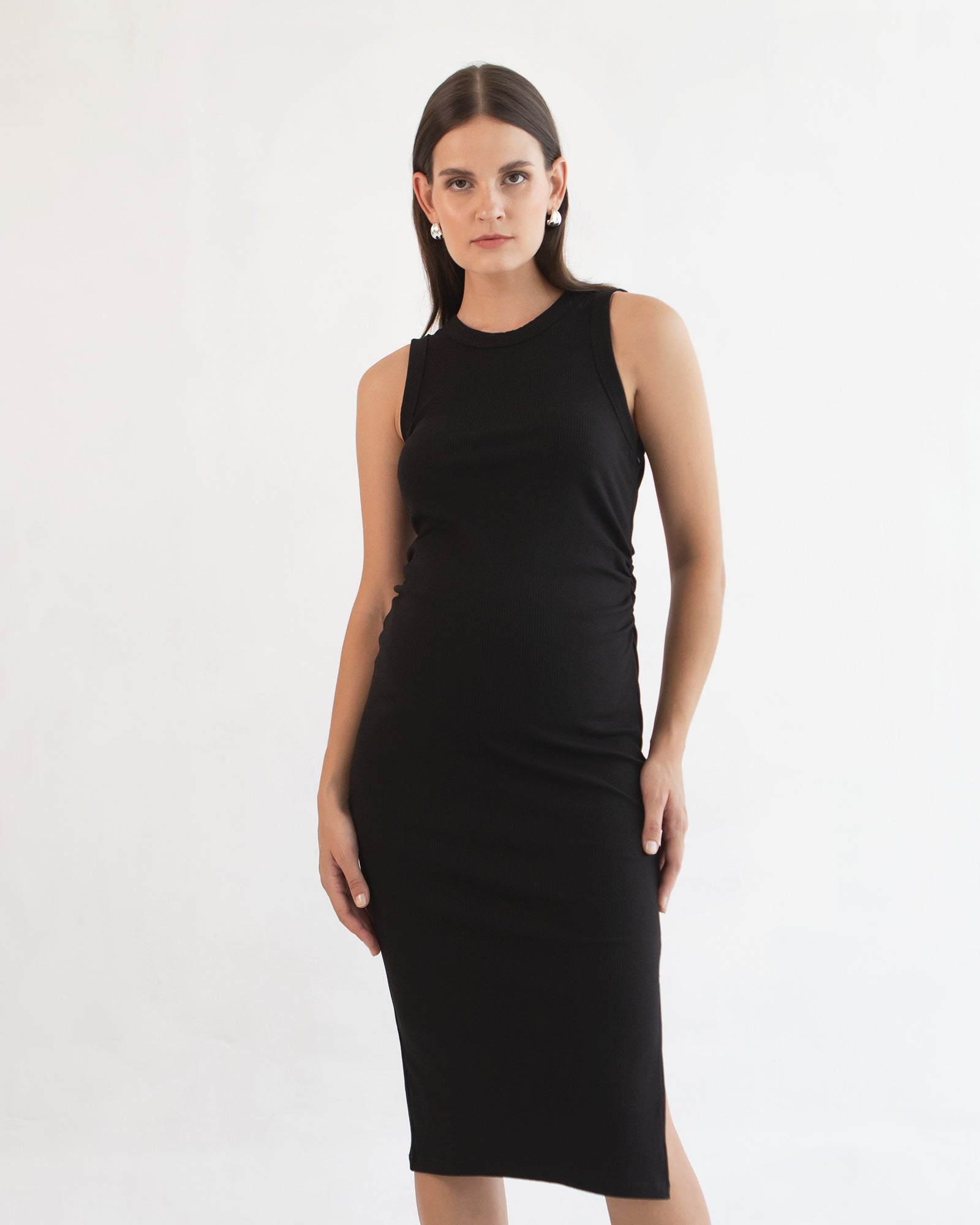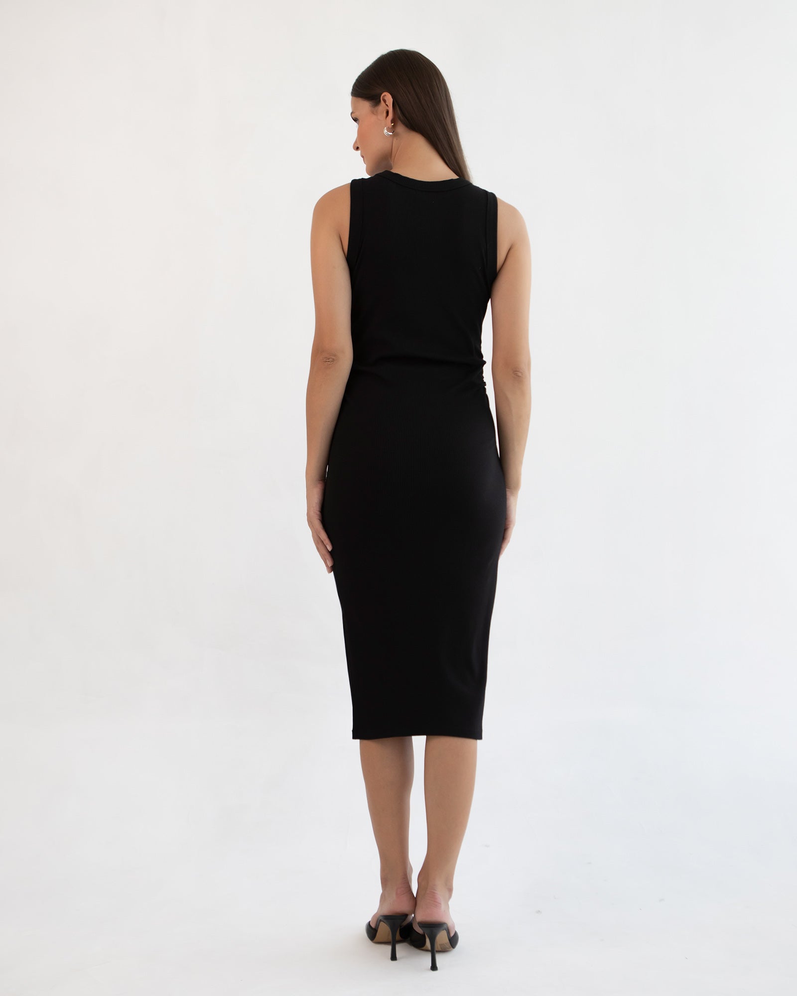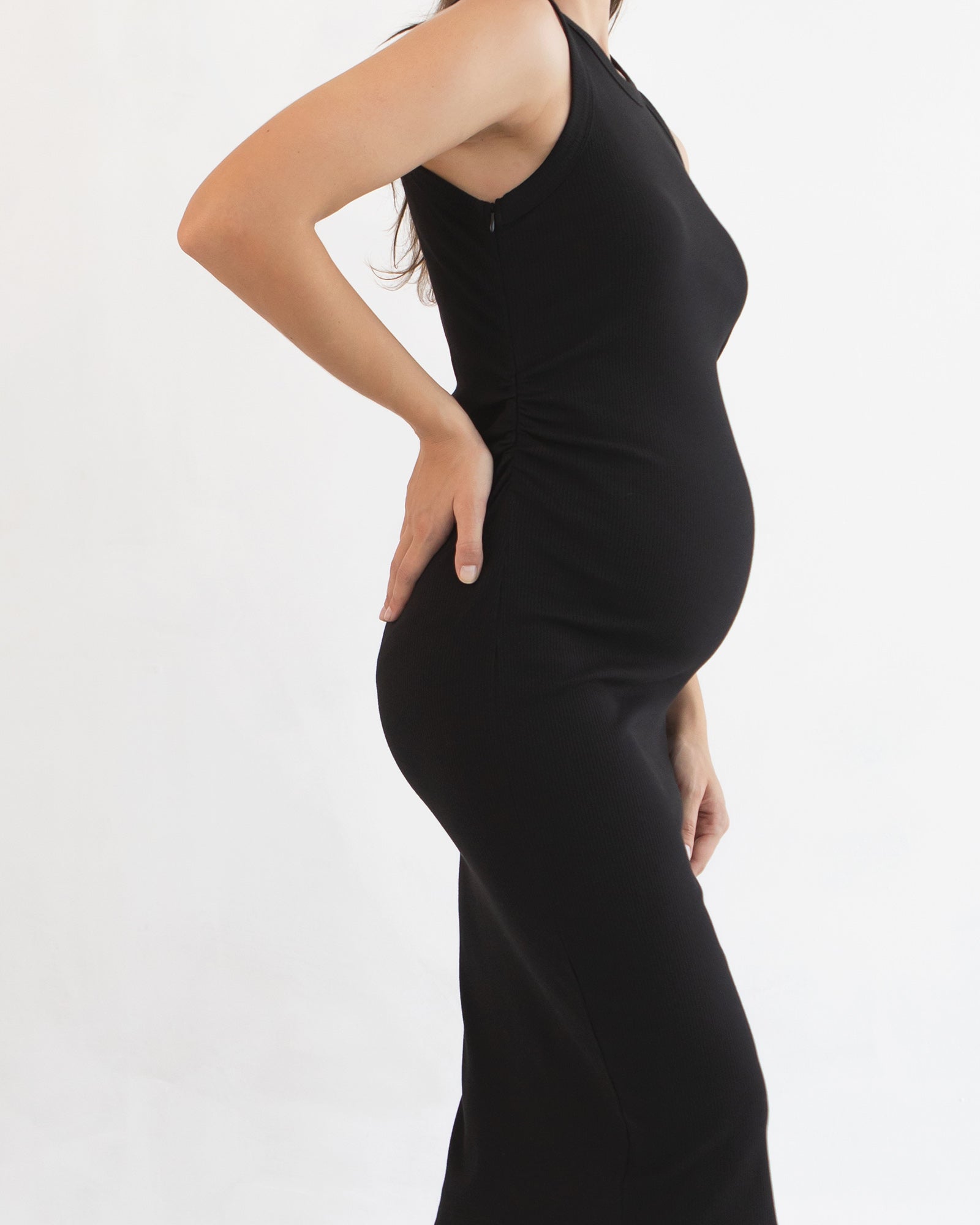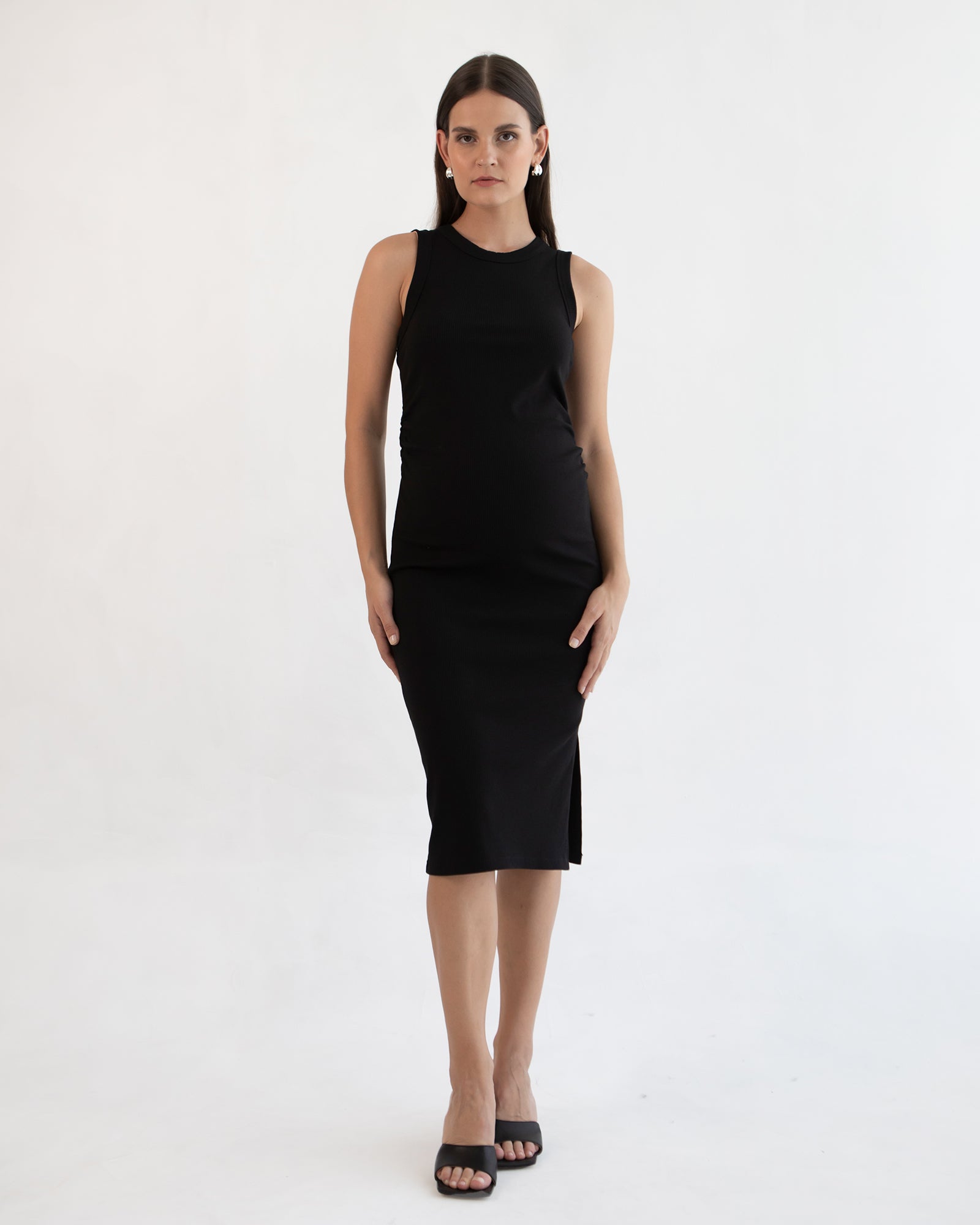 A classic bump hugging style that can take you from day to night is our Harper Bamboo Feeding Tank Dress. Available in black and also a neutral beige, it’s designed in a soft and stretchy rib bamboo fabric. It features side ruching so the dress can grow with you through all stages of pregnancy and hidden side zips for seamless nursing. Sitting at a midi length, the high round neck is flattering and there is wide binding around the arms and neck.