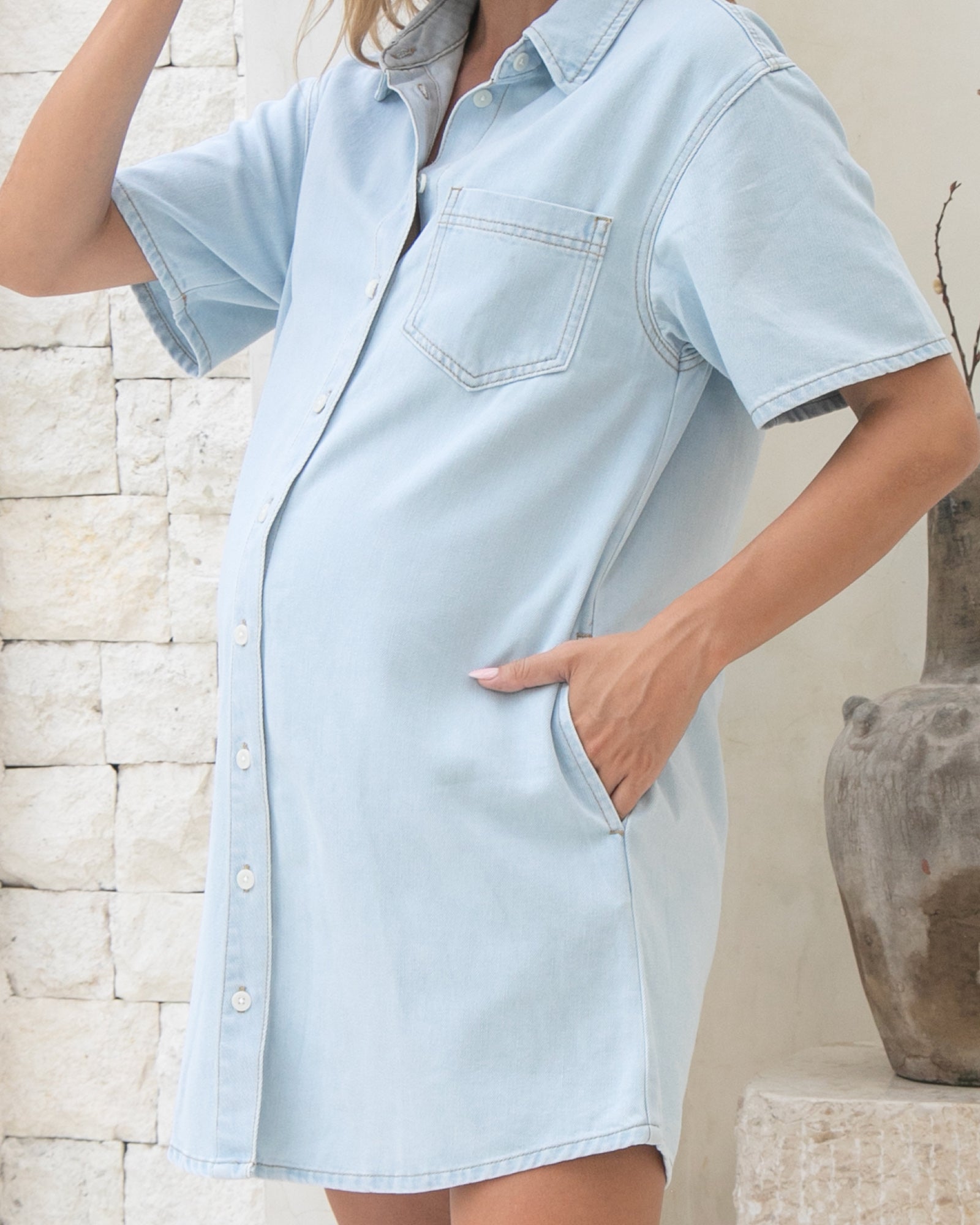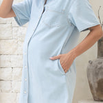 The Luna Denim Shirt Dress is a modern maternity essential designed for comfort and style from pregnancy to postpartum. Crafted in soft, lightweight denim, it features a relaxed silhouette, curved hemline, and a full button-down front for easy nursing access. Perfect for everyday wear, it can be styled effortlessly with sneakers or boots for a polished yet relaxed look.