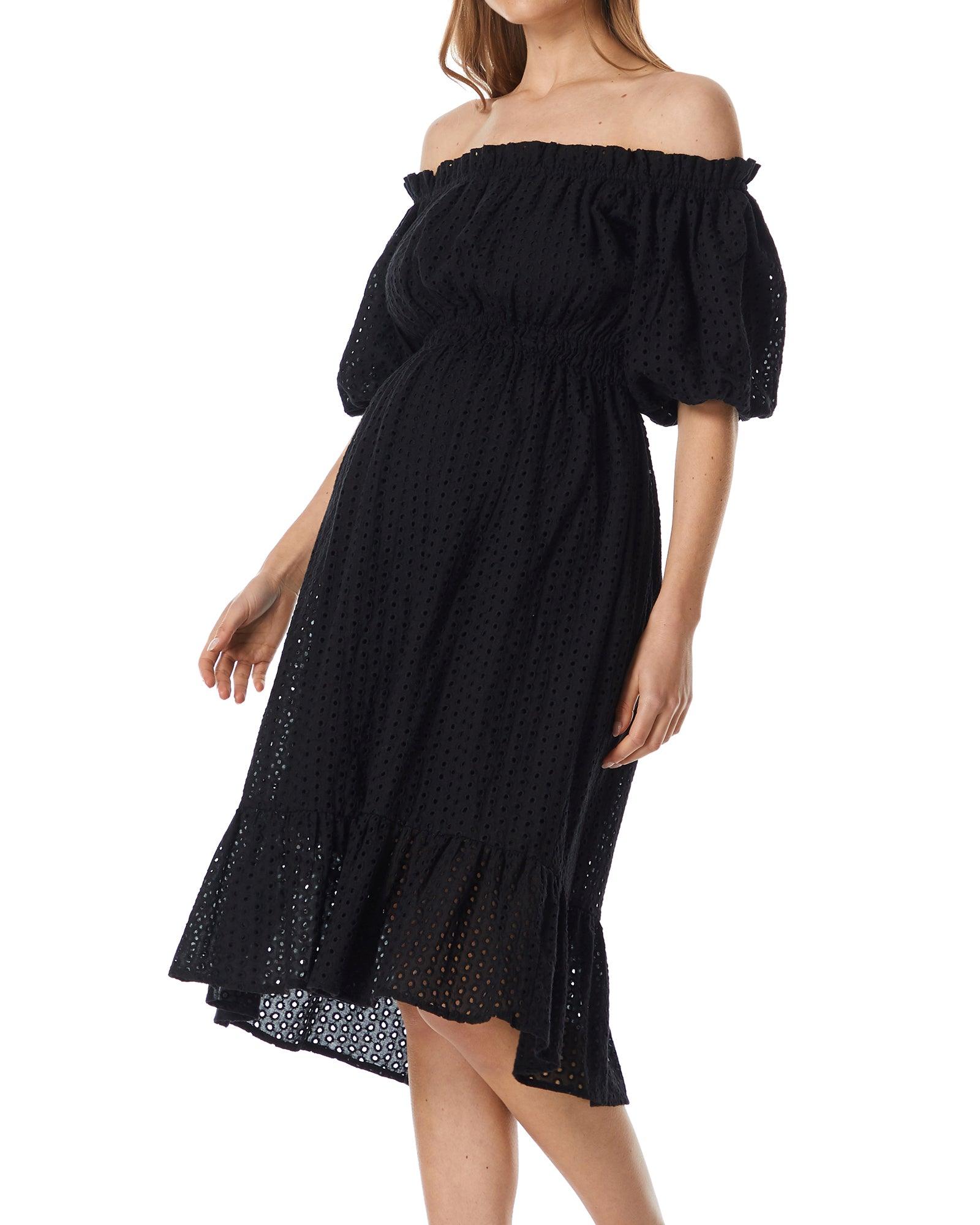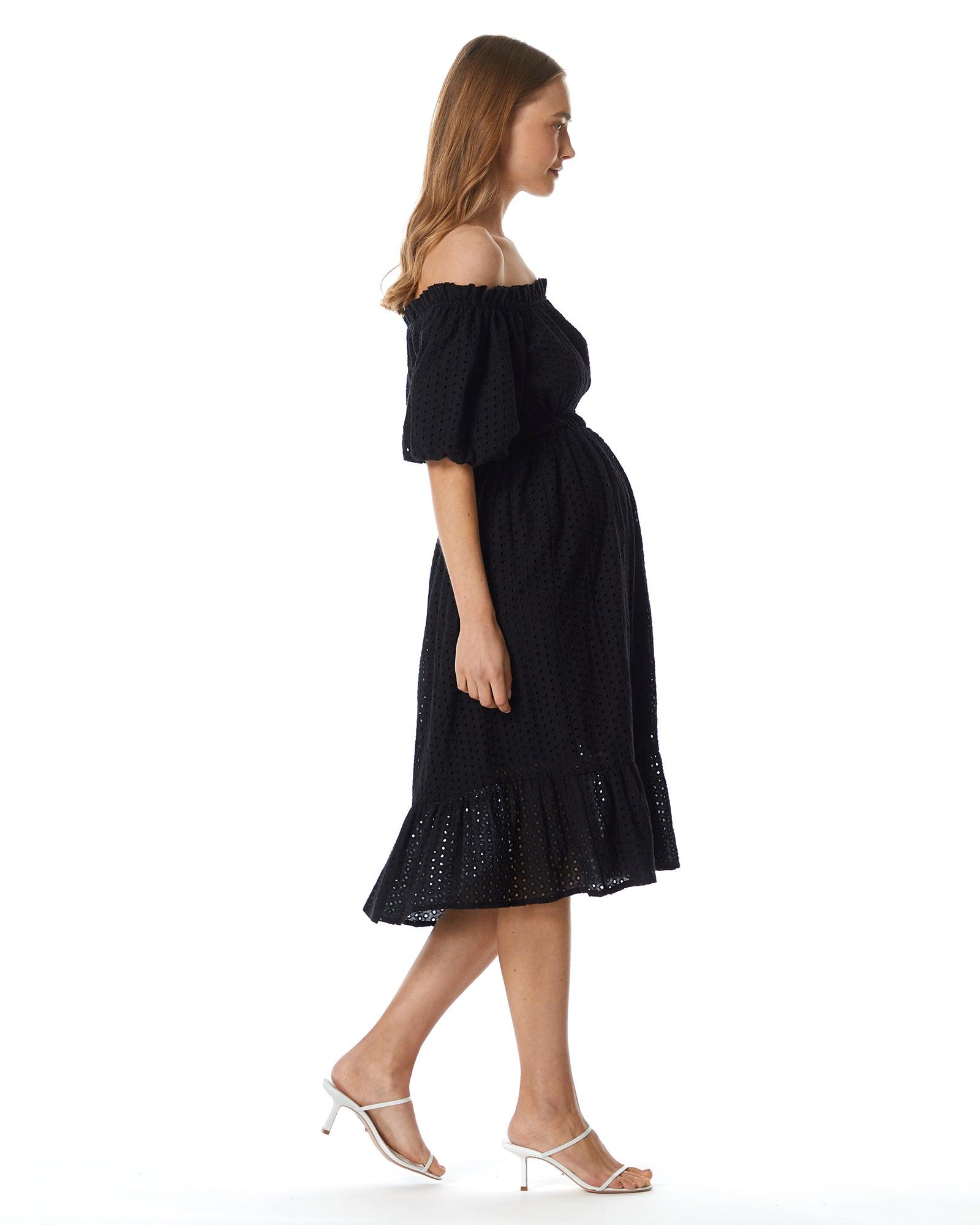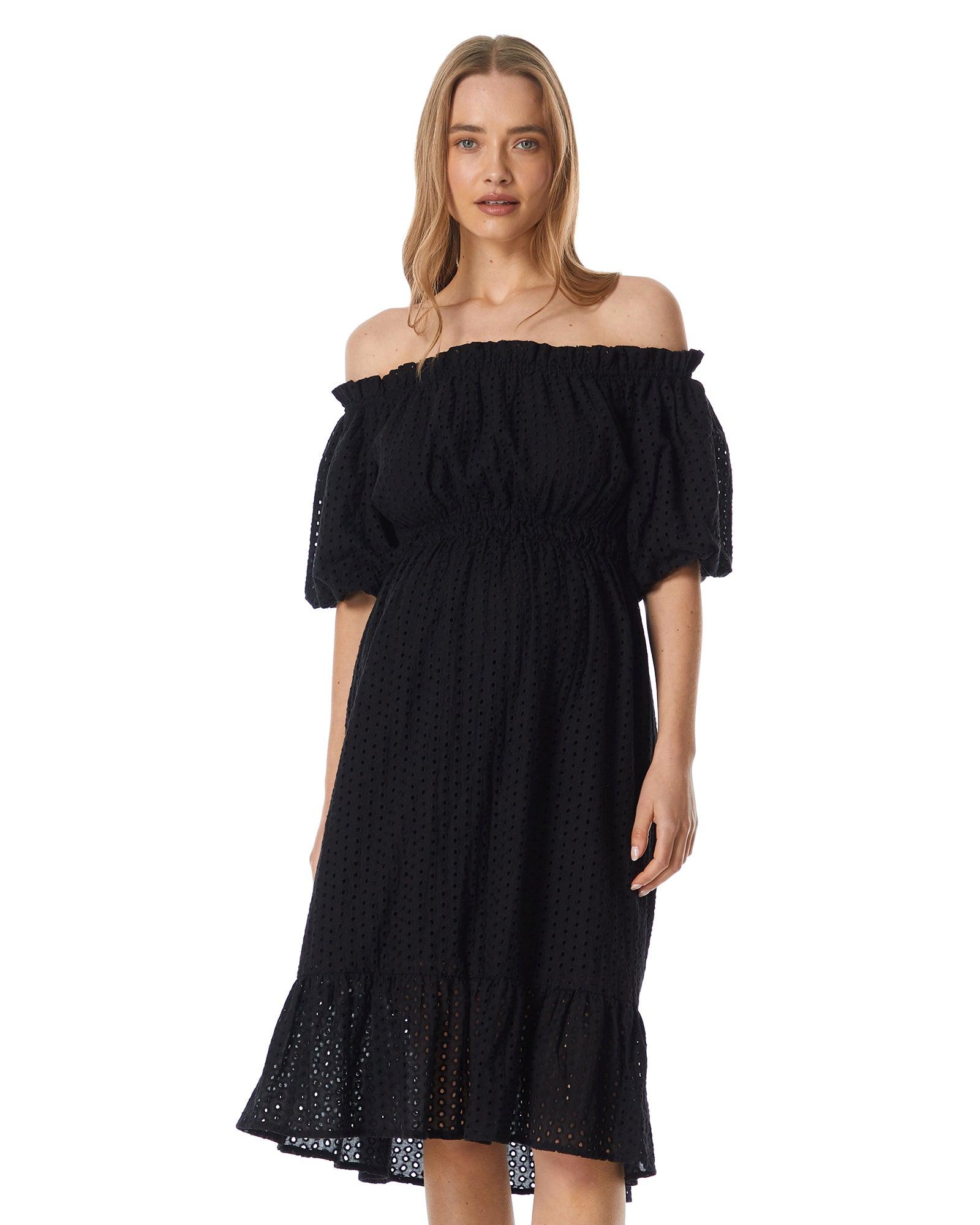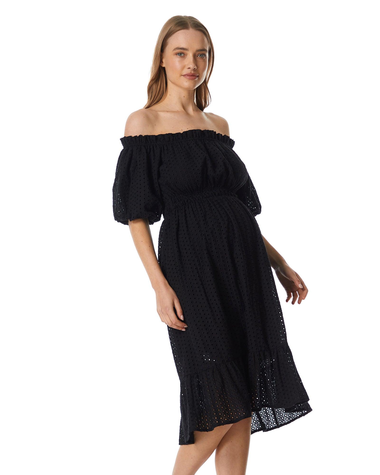 Designed in a beautiful embroidered fabric, our Reve Off Shoulder Midi Dress is perfect for your next special occasion. The elasticated waistband makes this a comfortable style through all trimesters and the puff sleeve & off shoulder silhouette is stylish and flattering. Cut in a midi length, the dress also features a frill hem.