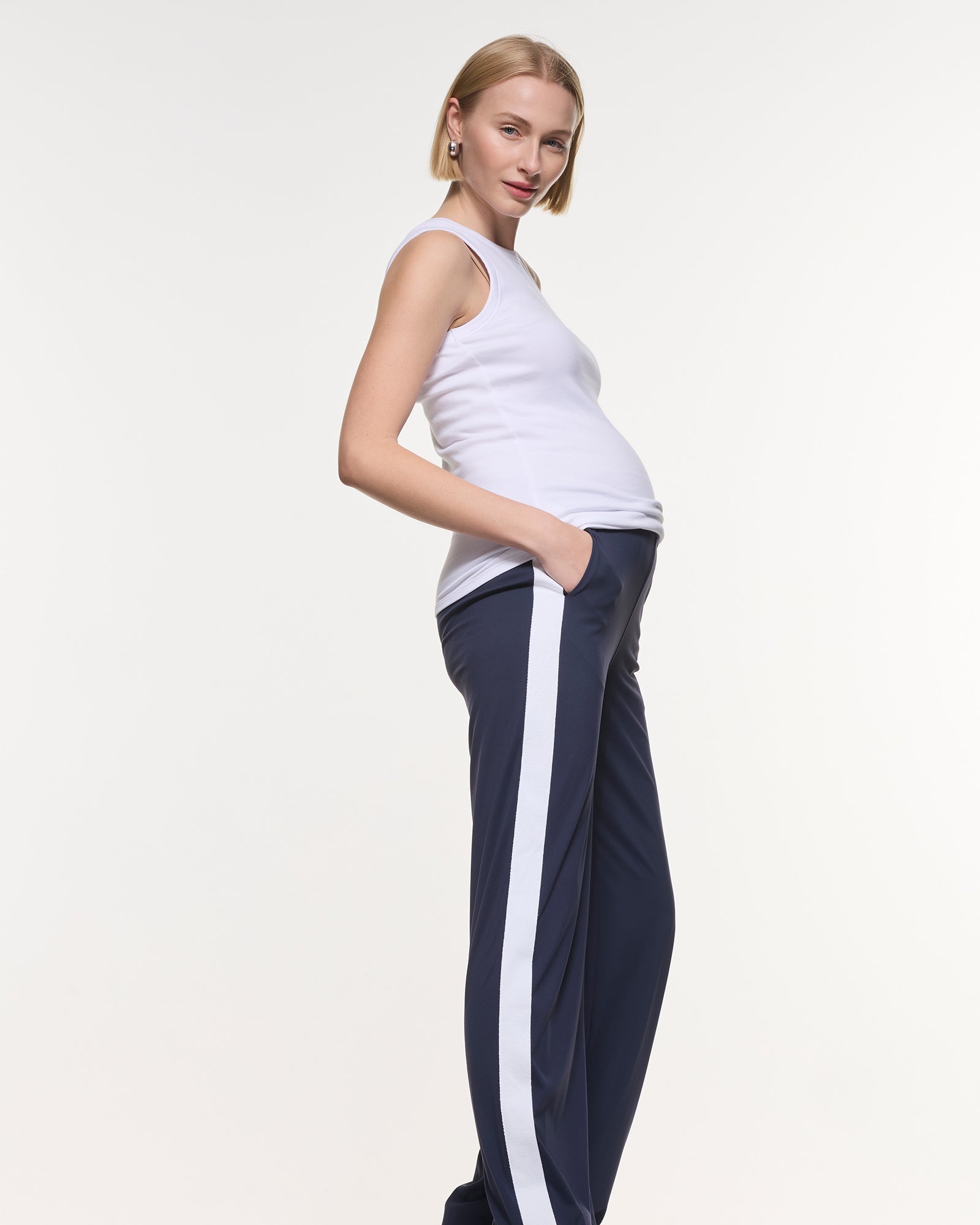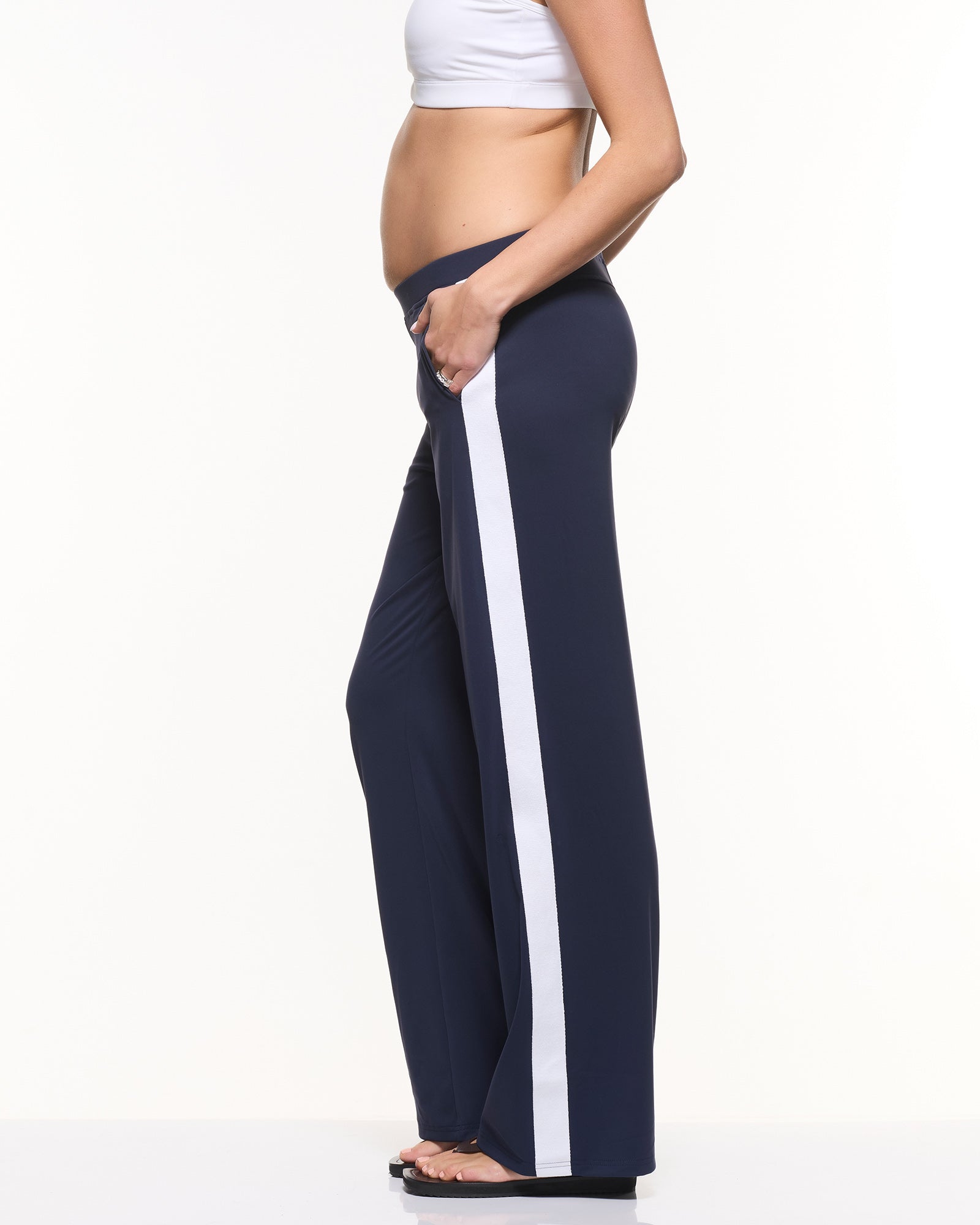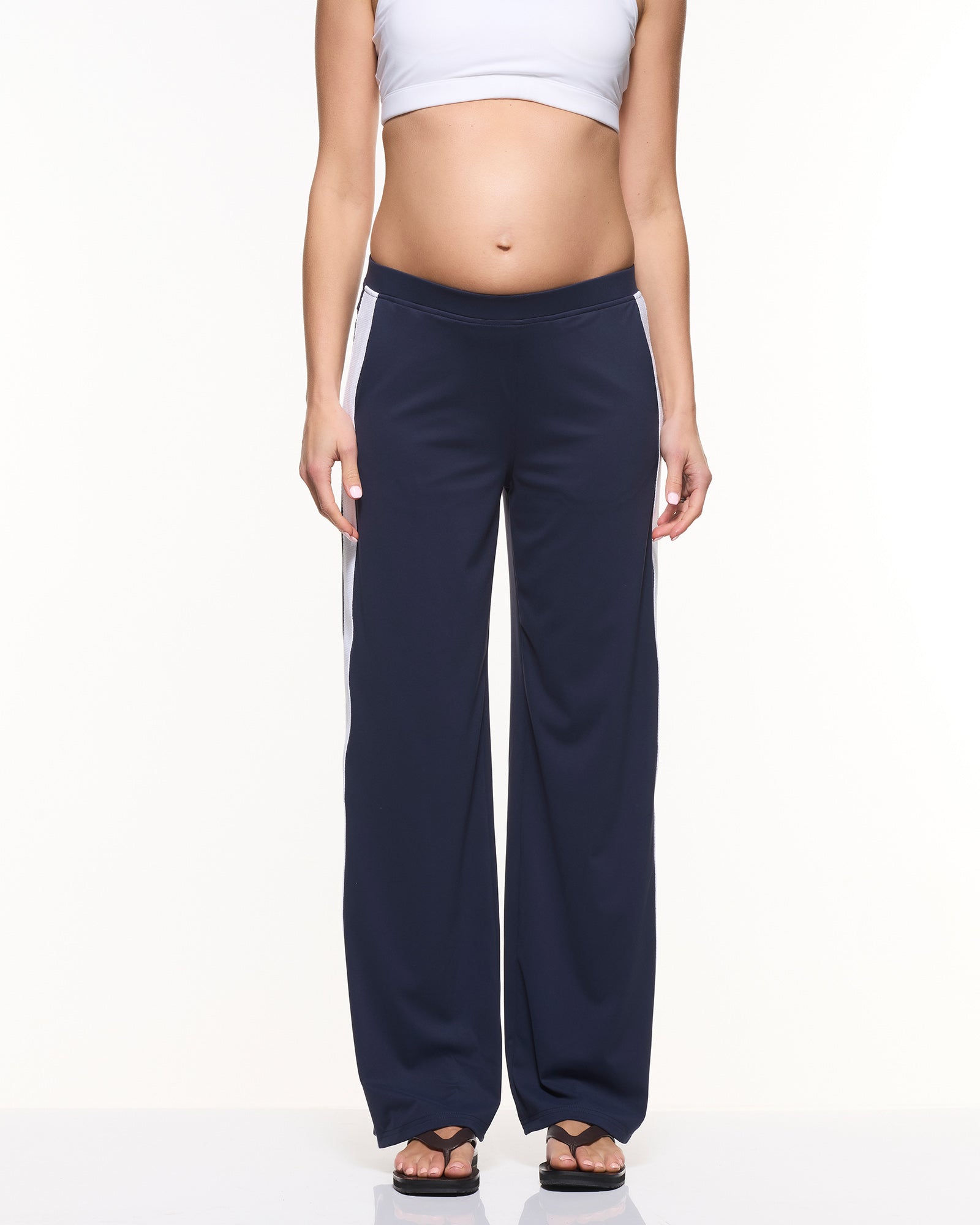 Sporty, stretchy, and seriously cool — our Super Stretch Straight Pants are your new everyday fave. Made in our buttery-soft, four-way stretch active fabric, they feature an on-trend wide leg and a bold white side stripe for extra style points. The comfy midrise elastic waistband supports you through every trimester (and long after), and yes — they have pockets! Perfect for mums on the move who want to look good and feel even better.