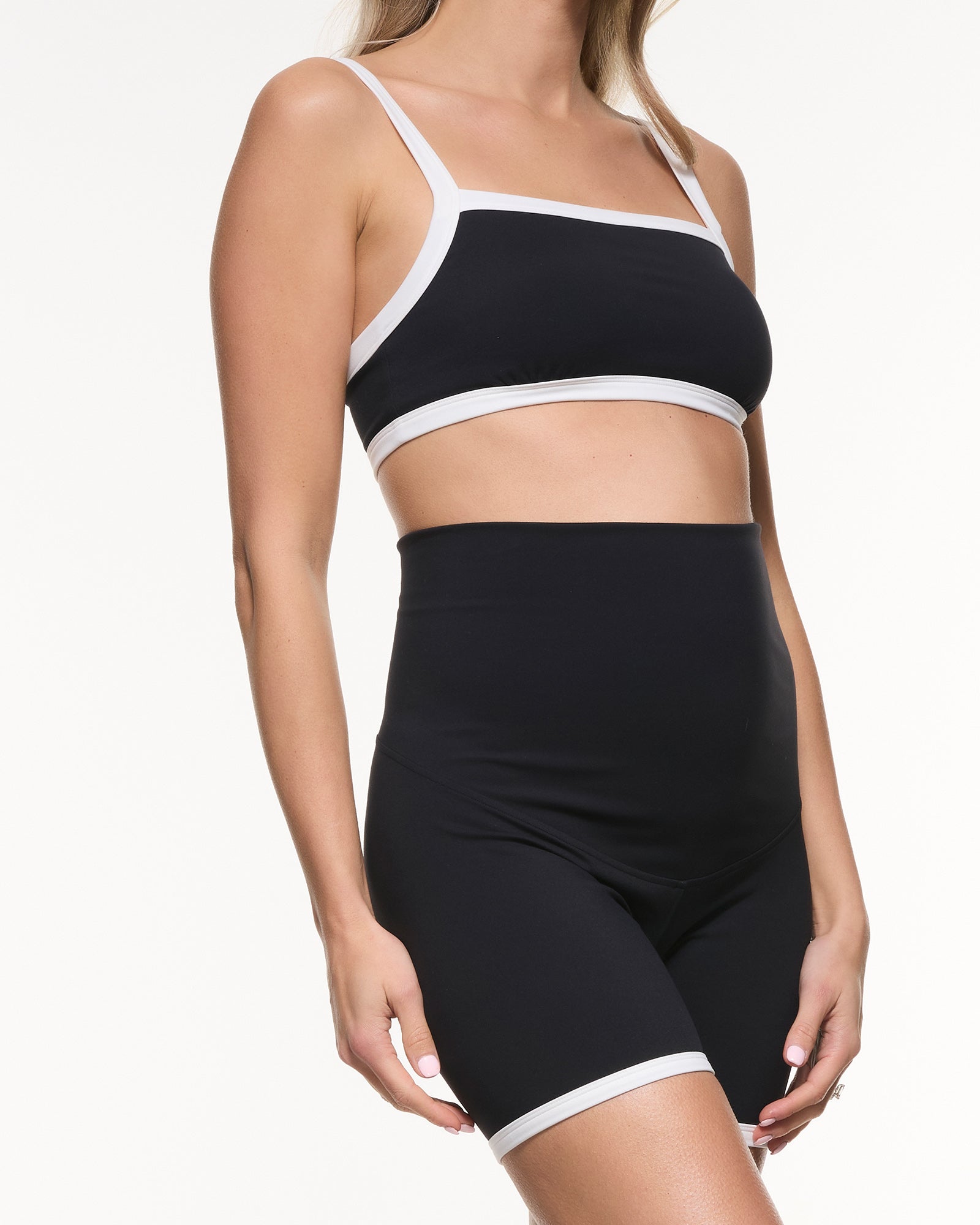 Designed for both style and support, our Two Tone Active Bra features a modern square neckline with contrast white trim for a fresh, elevated look. Made from soft, high-performance fabric, it offers gentle support through pregnancy and beyond. The adjustable straps ensure a custom fit, while the black-and-white design pairs effortlessly with any activewear bottoms. Perfect for workouts, walks, or simply everyday comfort.