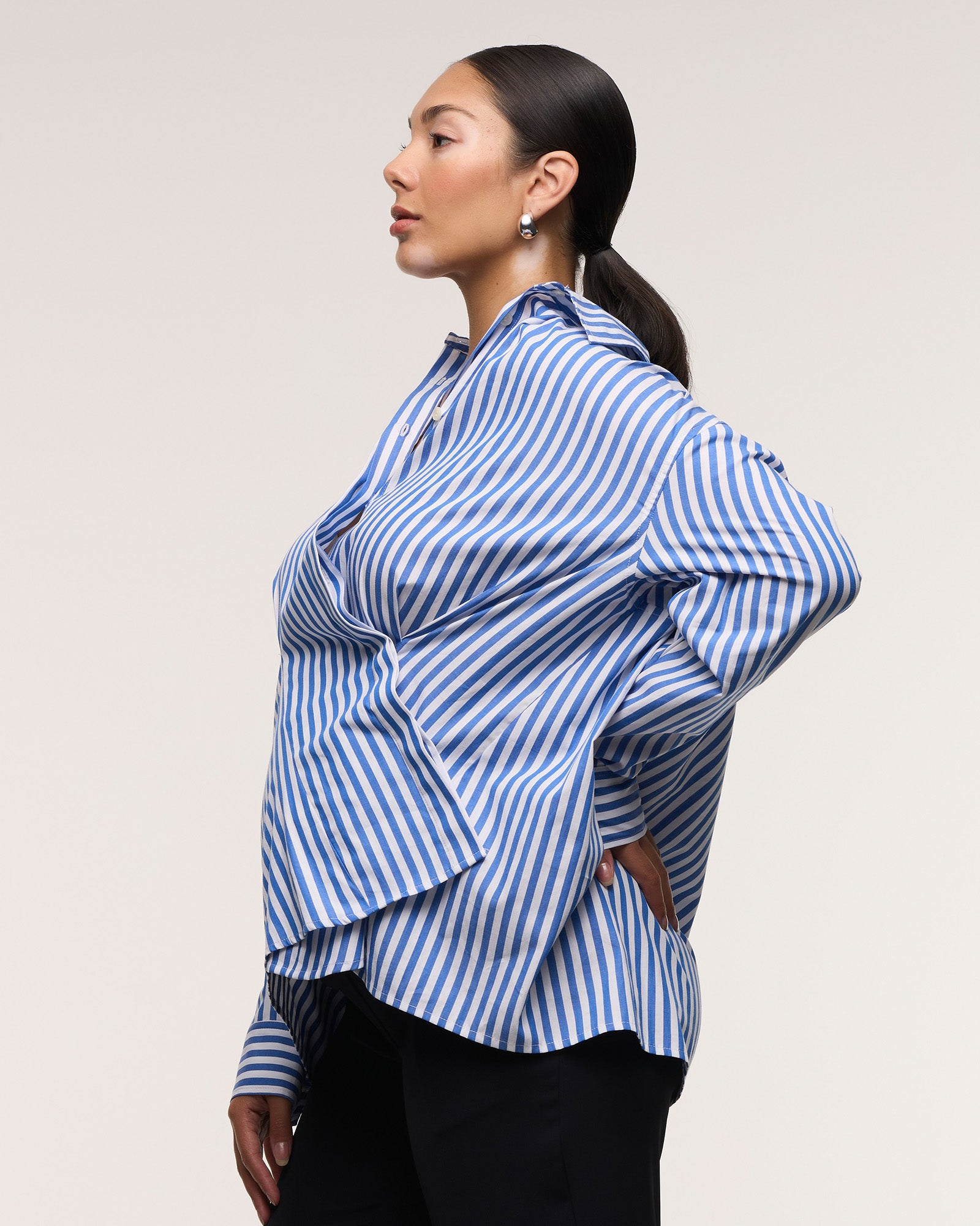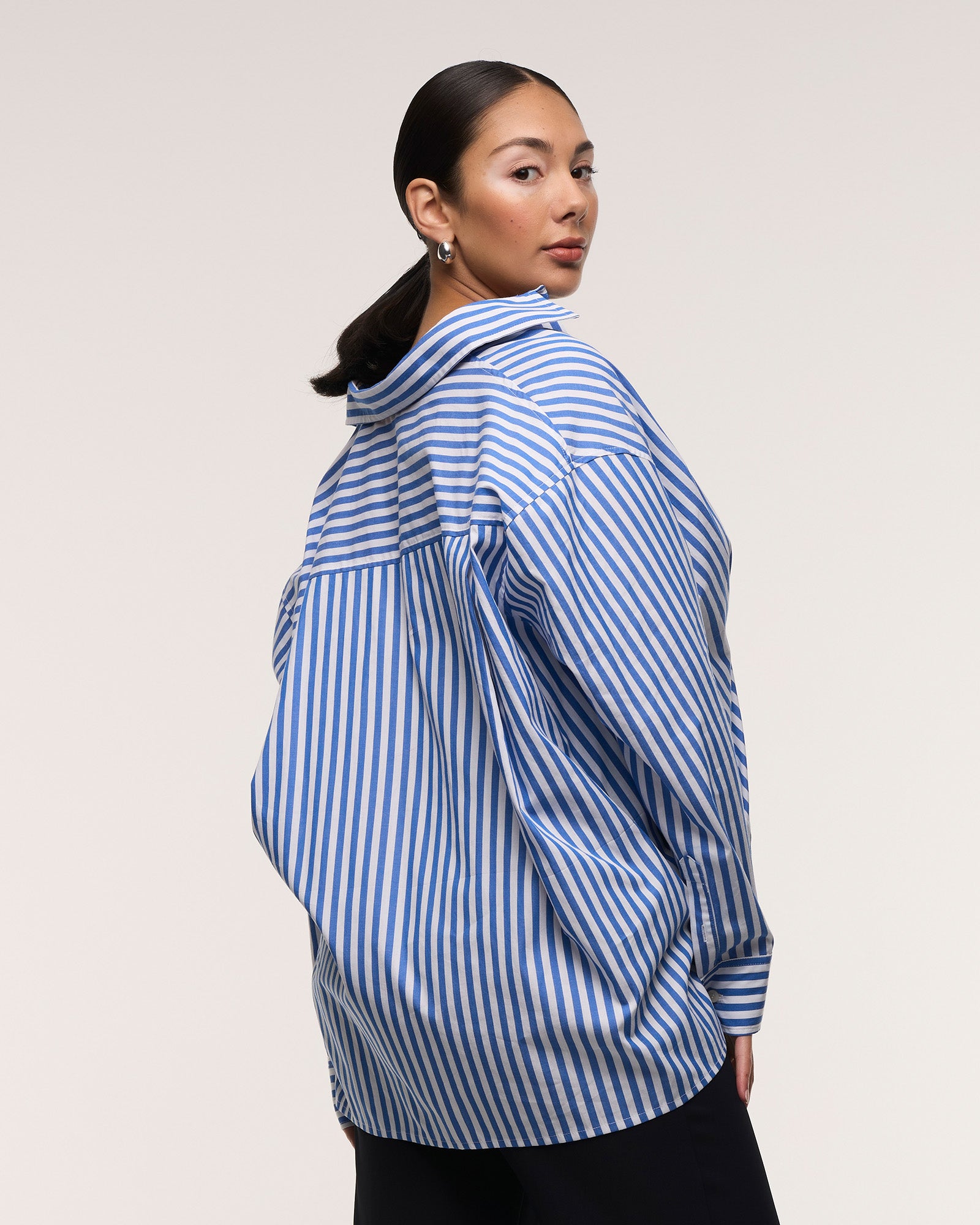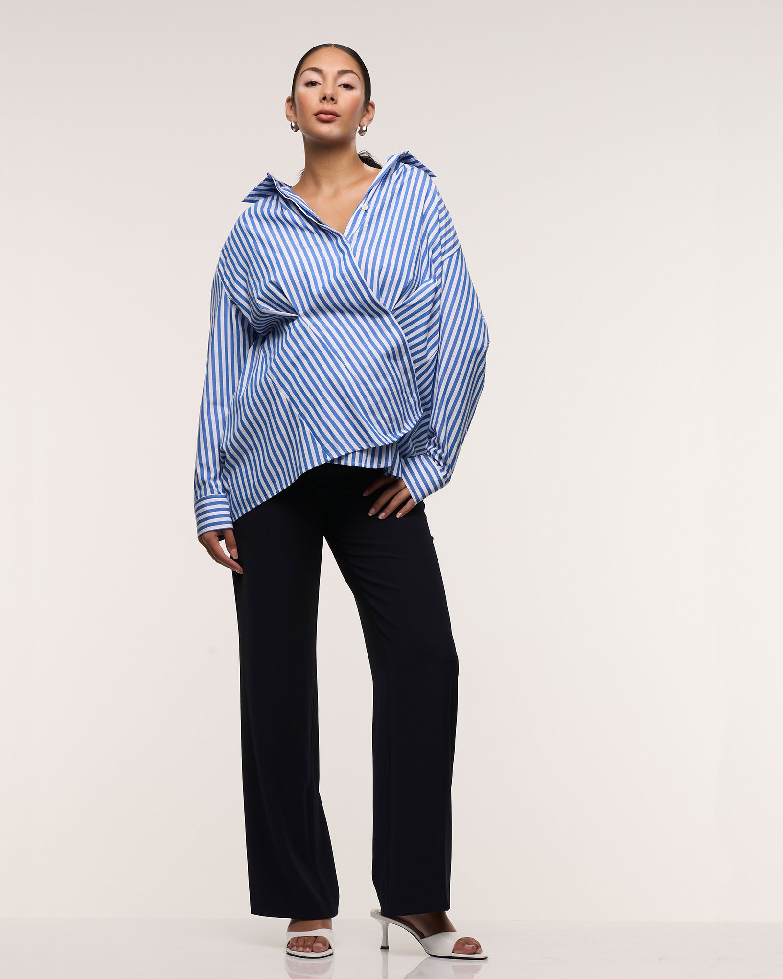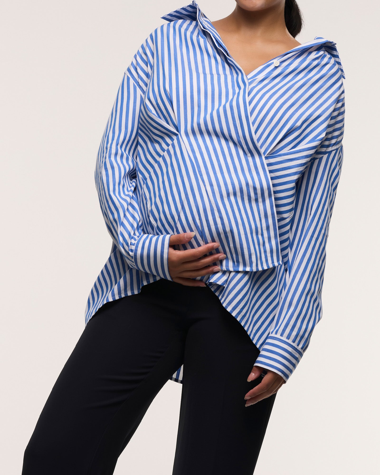 Our Alora Oversized Wrap Shirt will have you looking and feeling stylish with minimal effort. Designed with a full button down front for quick nursing, the clever button & dart design means that you can wear this shirt wrapped in on one side to give you some extra shape around the waist and wear slightly off the shoulder. Available in a classic blue & white stripe and a green & white stripe, it’s ideal office attire with a pair of black pants or pop it with some denim for a cool off duty look.
