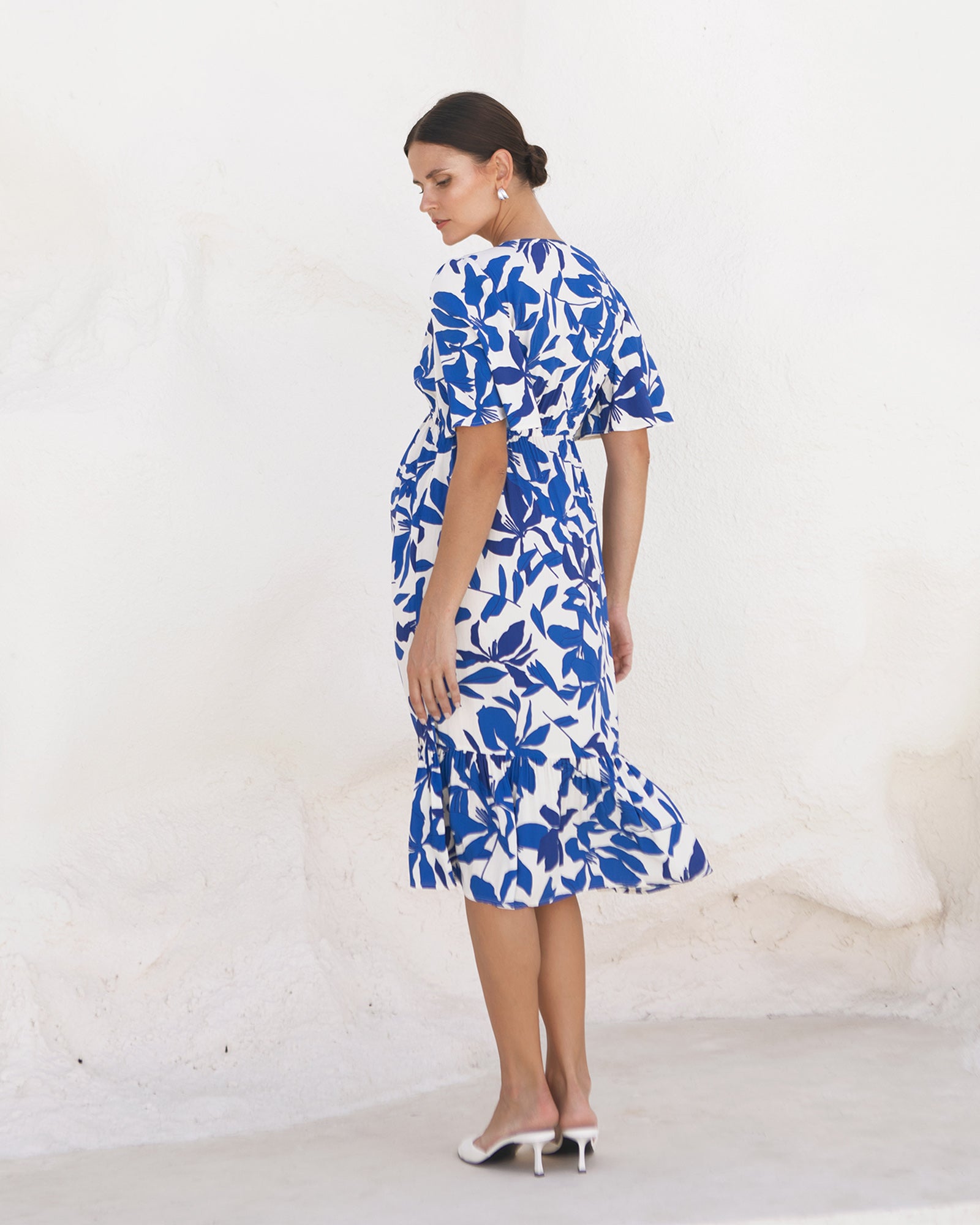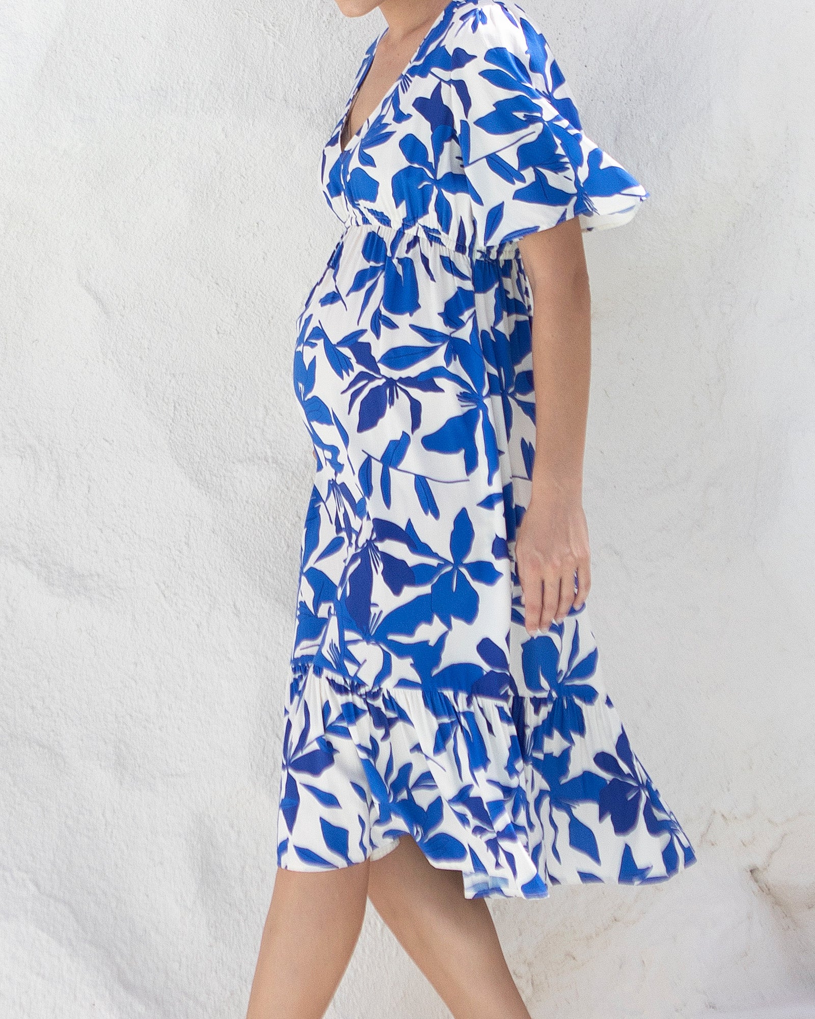 A printed midi dress that is perfect for any occasion! Our Anika Midi Feeding Dress has a flutter sleeve, frill hem and full elastic under the bust meaning that it drapes beautifully over the belly through all trimesters. It also features hidden side zips for discreet and easy feeding.