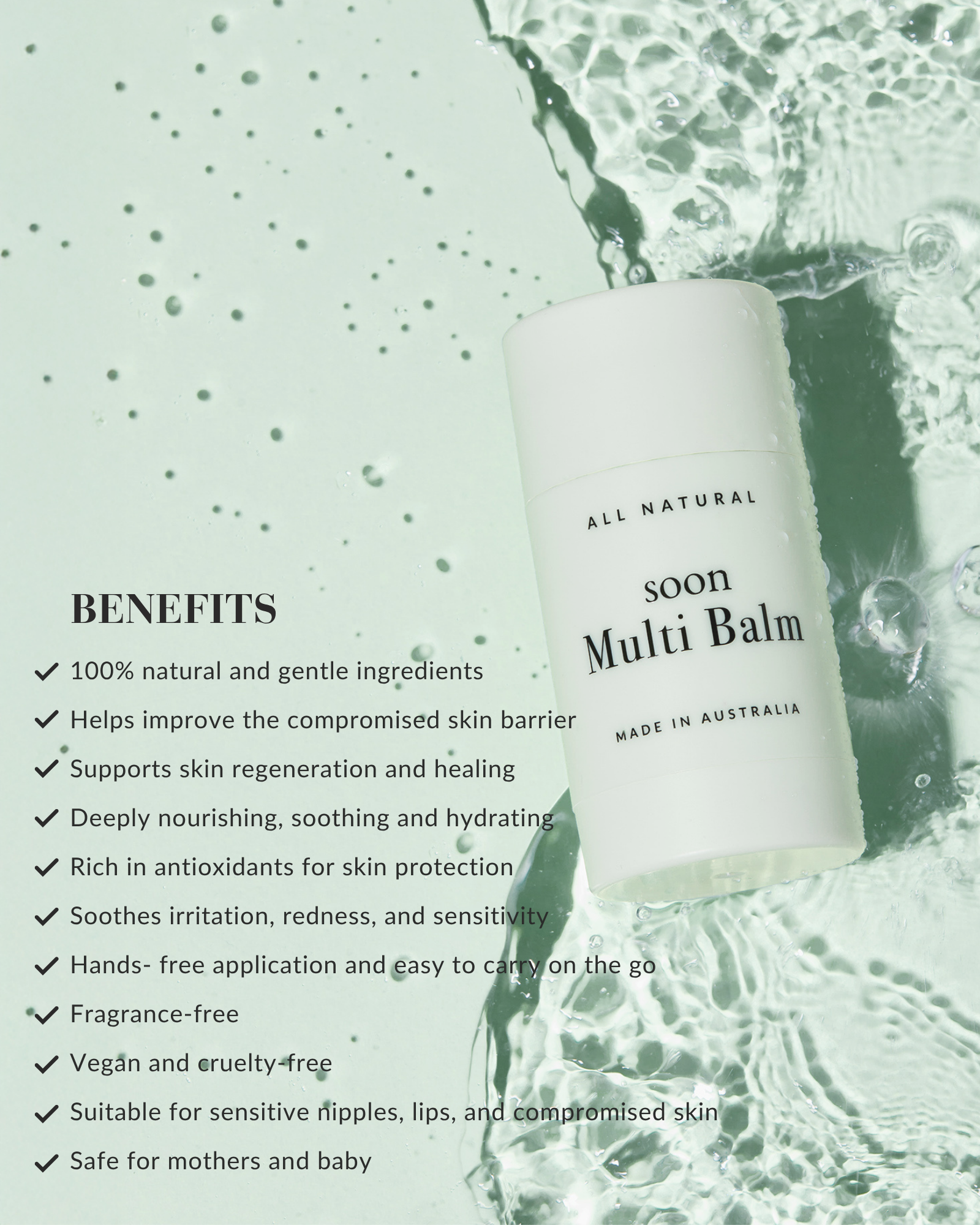 Our all-natural Multi Balm is deeply hydrating and designed for sensitive nipples, lips, and dry patches. Gentle enough for delicate skin. Easy enough to take anywhere.